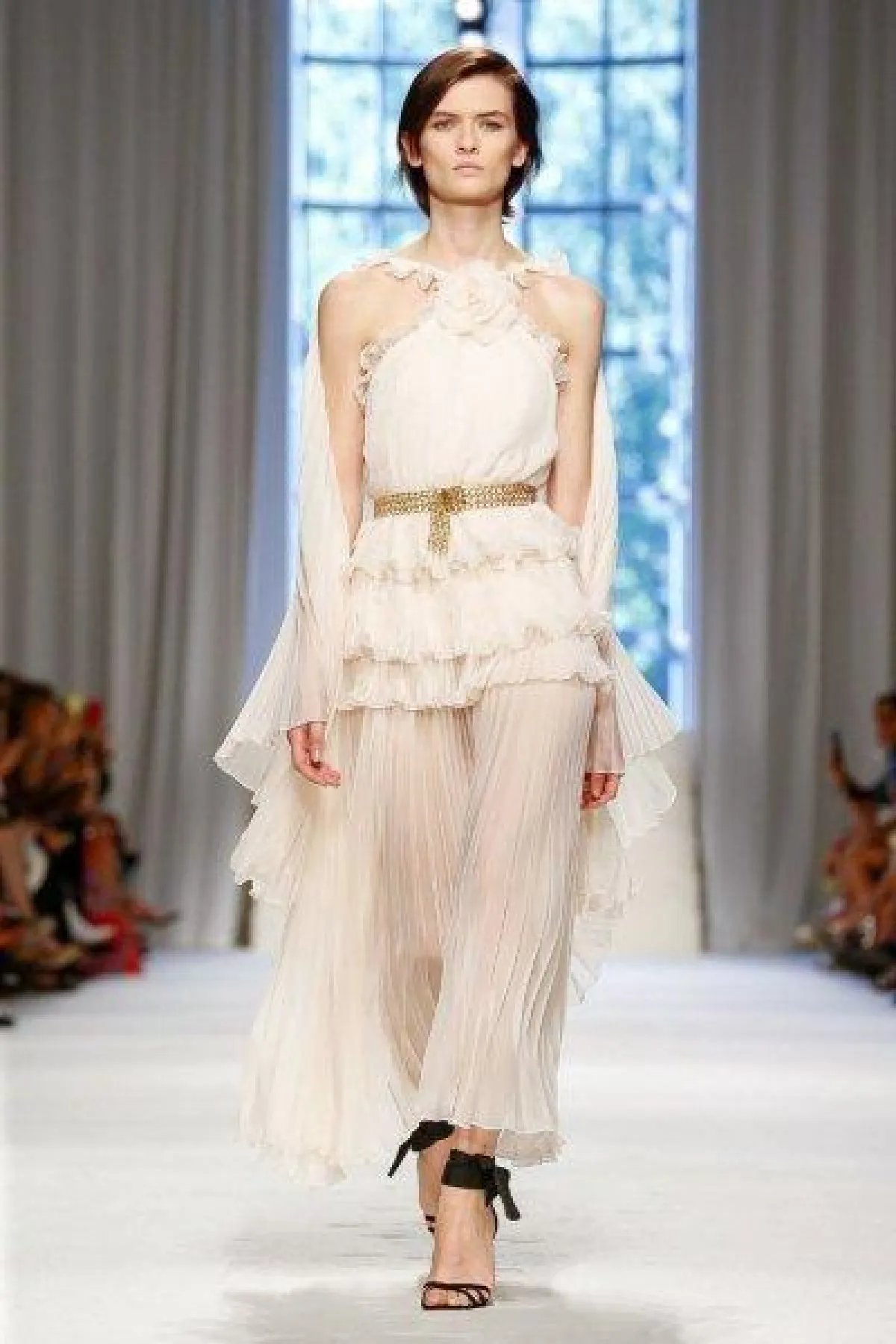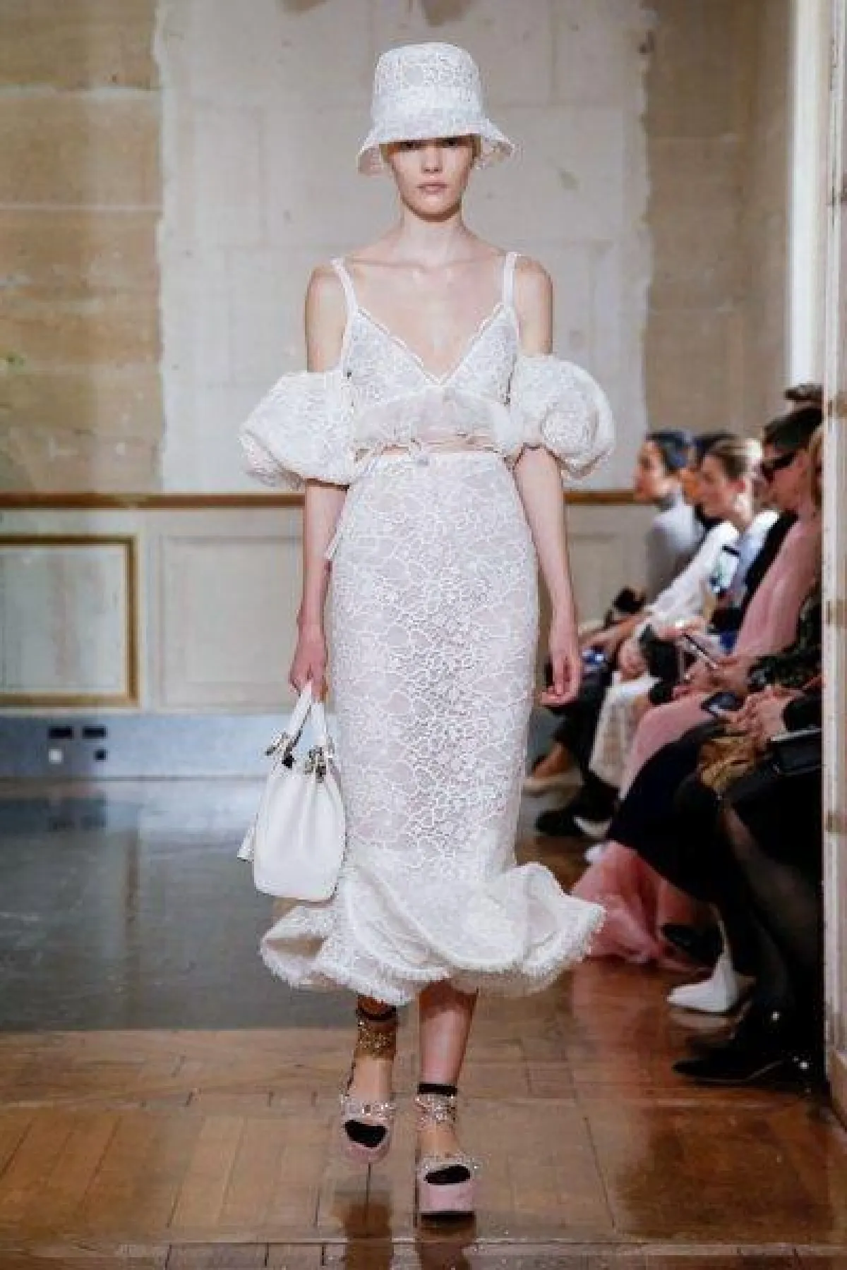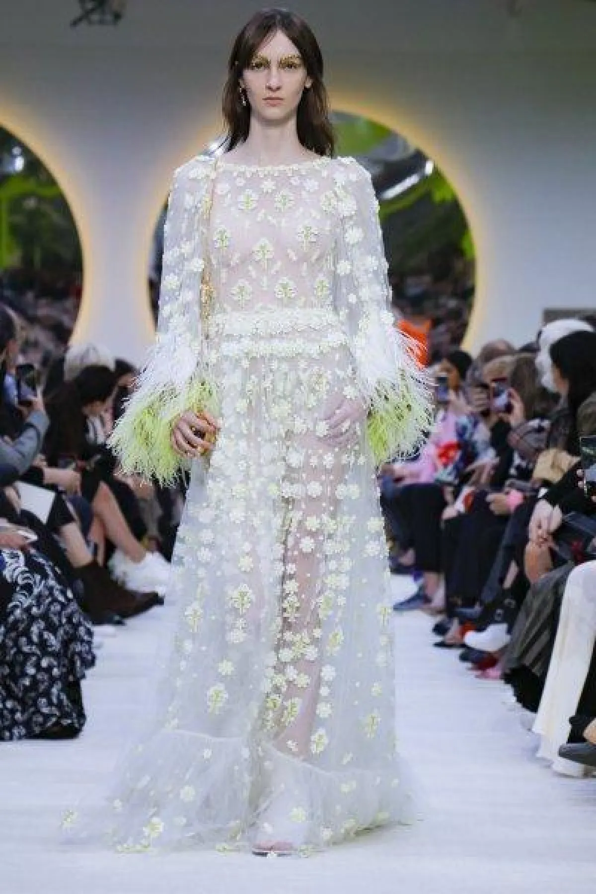 فساتين فالنتينو بأقمشة شفافة ومطرزة باللون الأبيض، مع لمسات عصرية مثل الفستان المزين بلمسة وردي نابضة بالحيوية، والفستان المزين بالشراشيب.