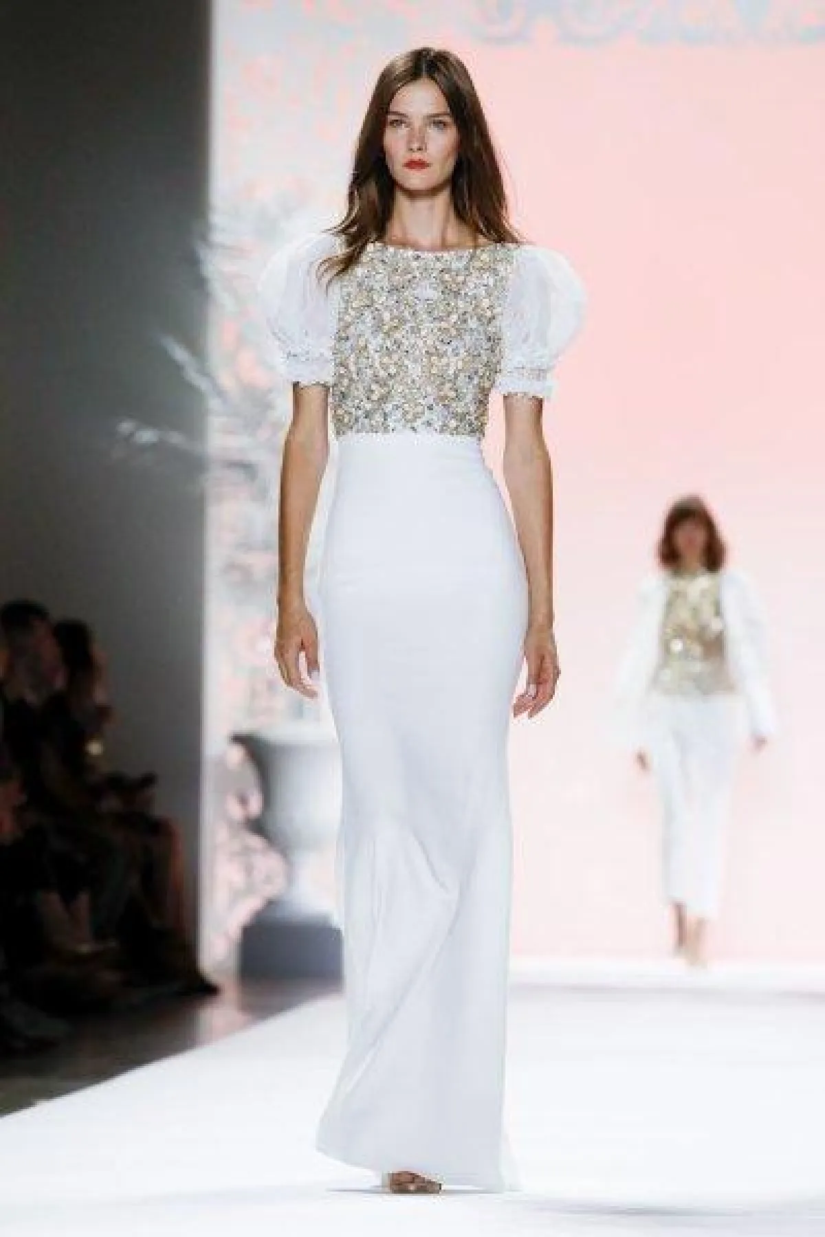 قدمت ماركة بادجلي ميشكا Badgley Mischka فساتين عمودية بتصاميم مختلفة، ومنها الفساتين المزودة بلمسات ملونة مثل الفستان المزين بالورود، وأخرى مرصعة بتطريزات برّاقة مثل الفستان بالأكمام المنفوخة القصيرة.