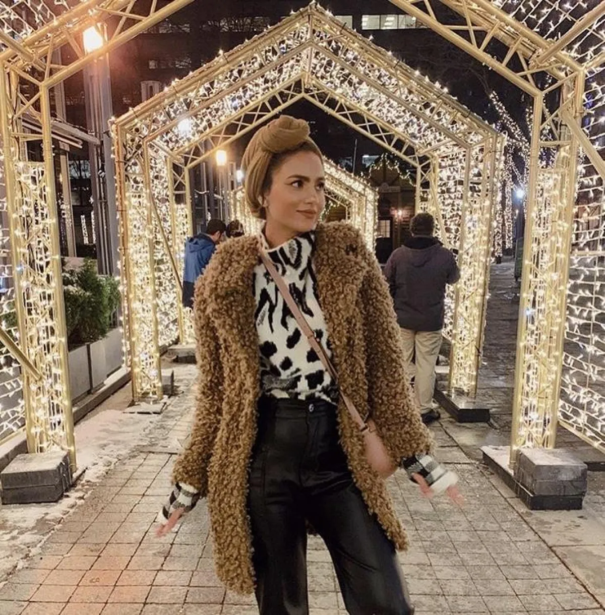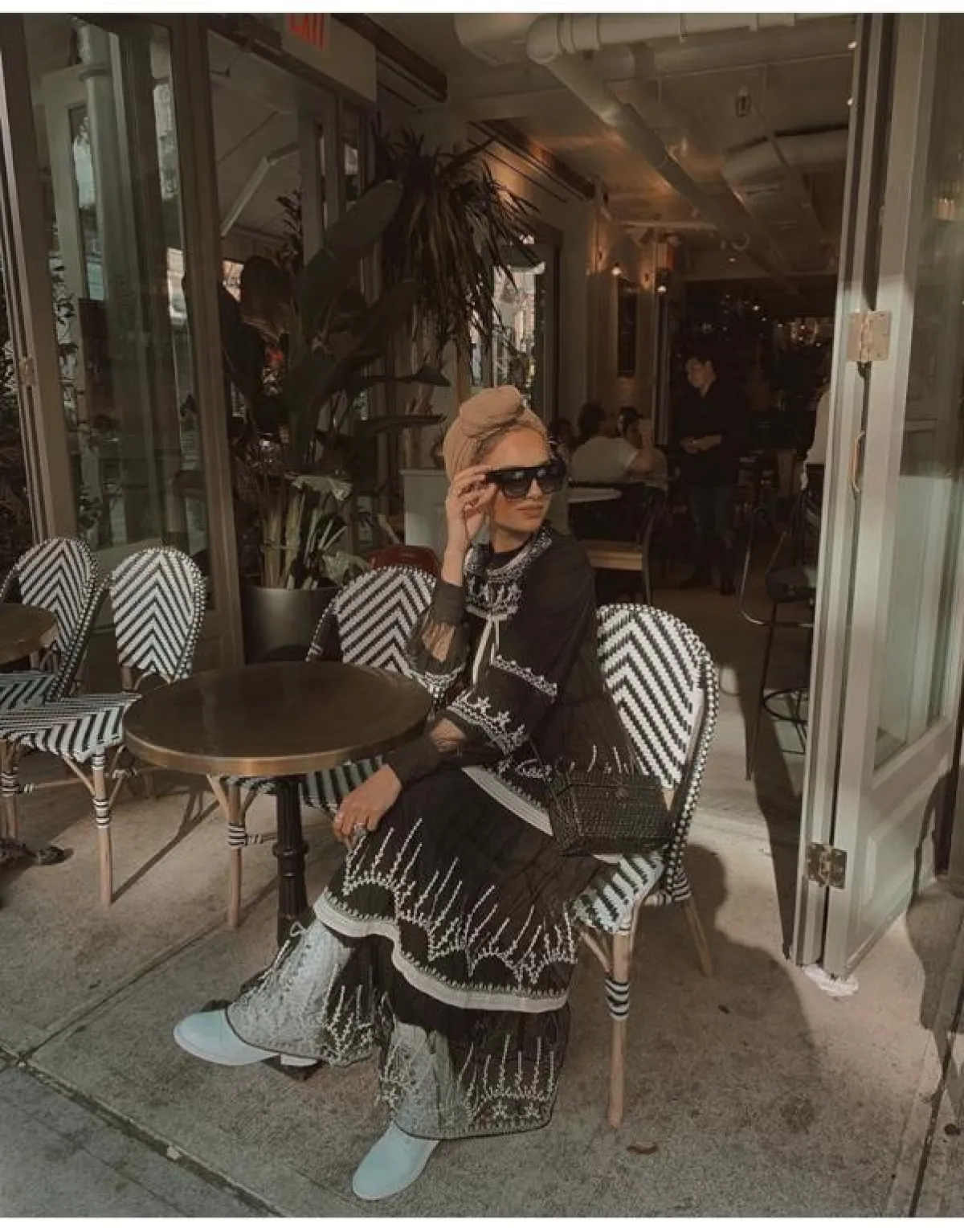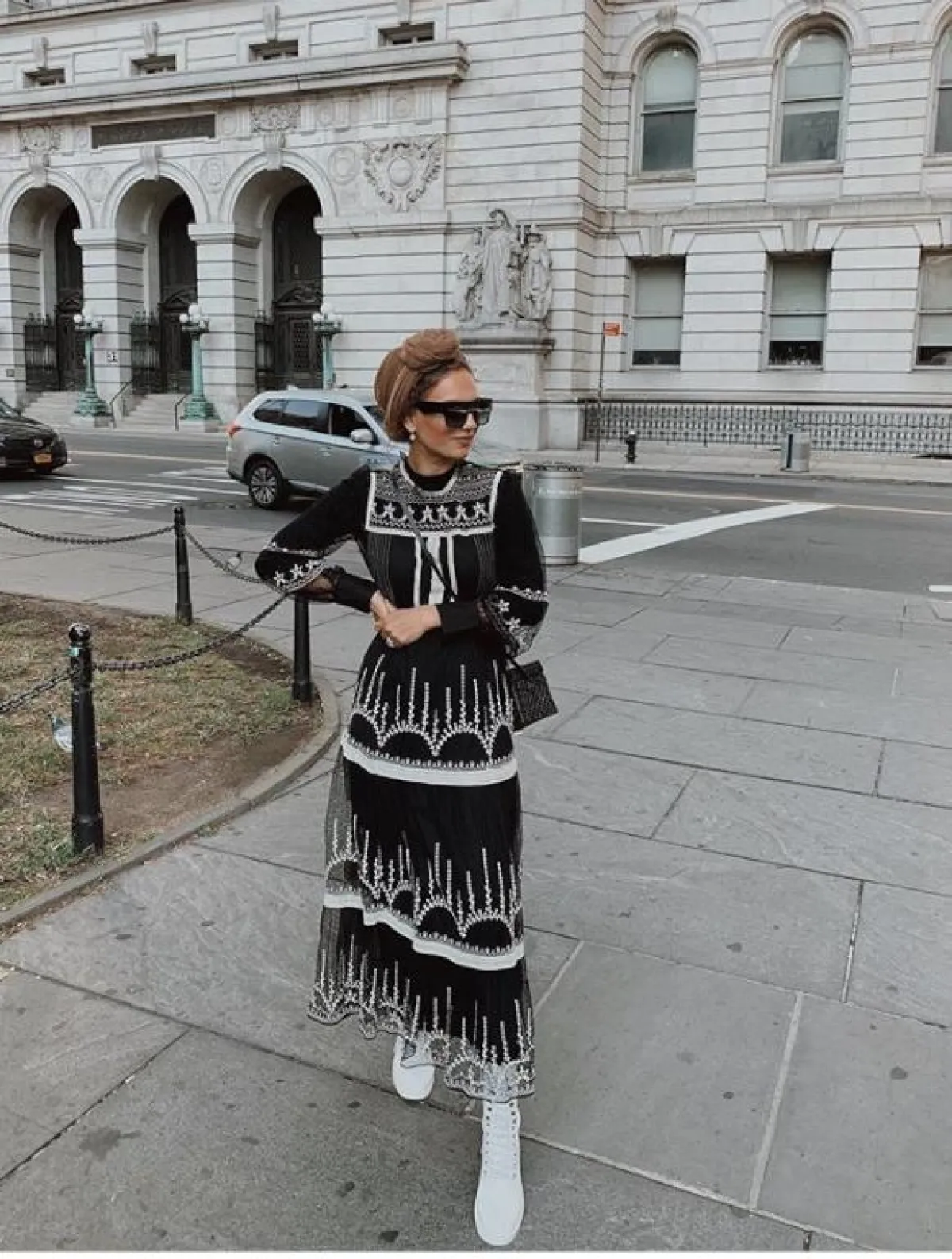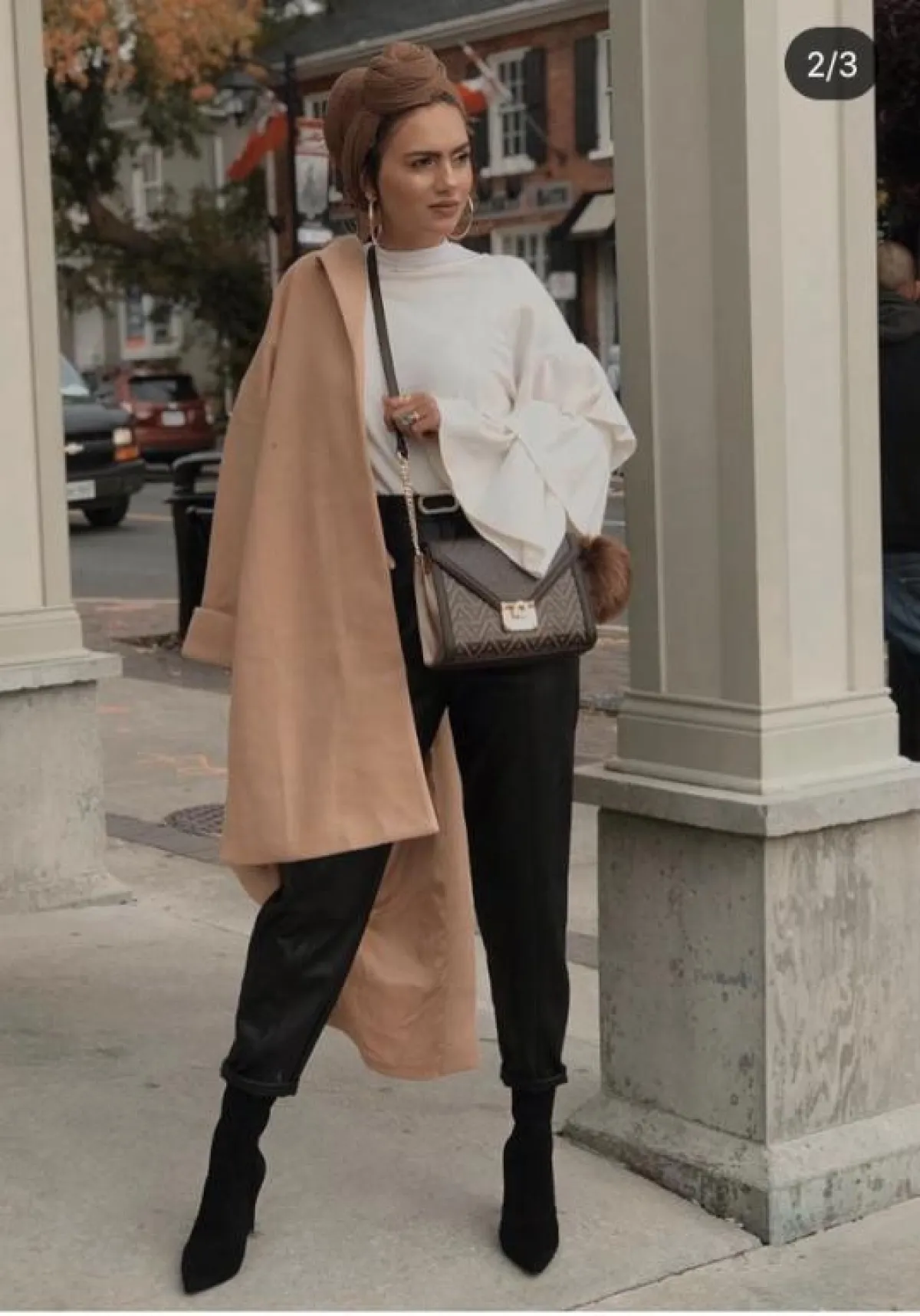 نسقت ظهيرة البوت الأسود مع الجمبسوت لتنسيق ذكي يجعلها تبدو أطول، مع شنطة بيد طويلة وتوربان باللون البيج المخملي.