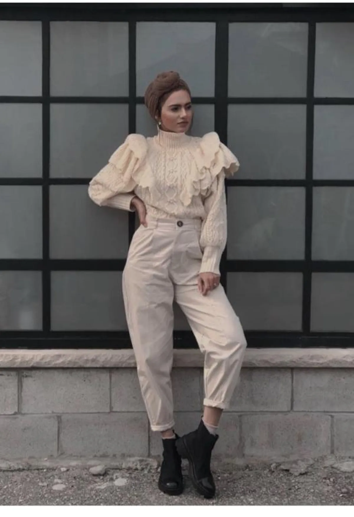 هذا اللوك مثالي للصبايا النحيفات بشكل كبير، بخاصة مع الكشكش على البلوزة، ليمنحكِ بعض الحجم لمظهركِ.