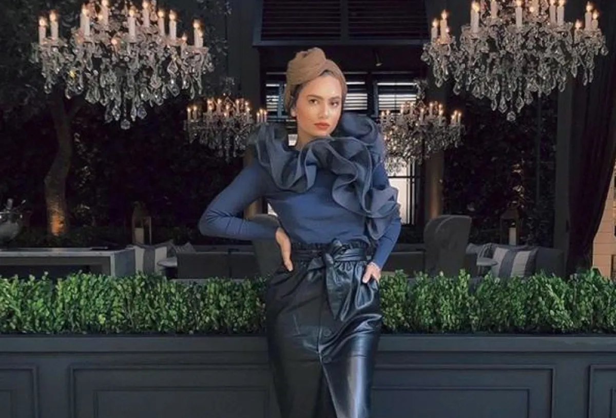 أعجبنا هذا اللوك المميز للتنورة الجلد القصيرة مع الفتحة الأمامية، وكيف نسقتها الفاشينيستا ظهيرة لكي تناسب الصبايا المحجبات، إذ اعتمدت بوت الساق الأسود بلون التنورة نفسه، واختارت بلوزة كشكش باللون البترولي.