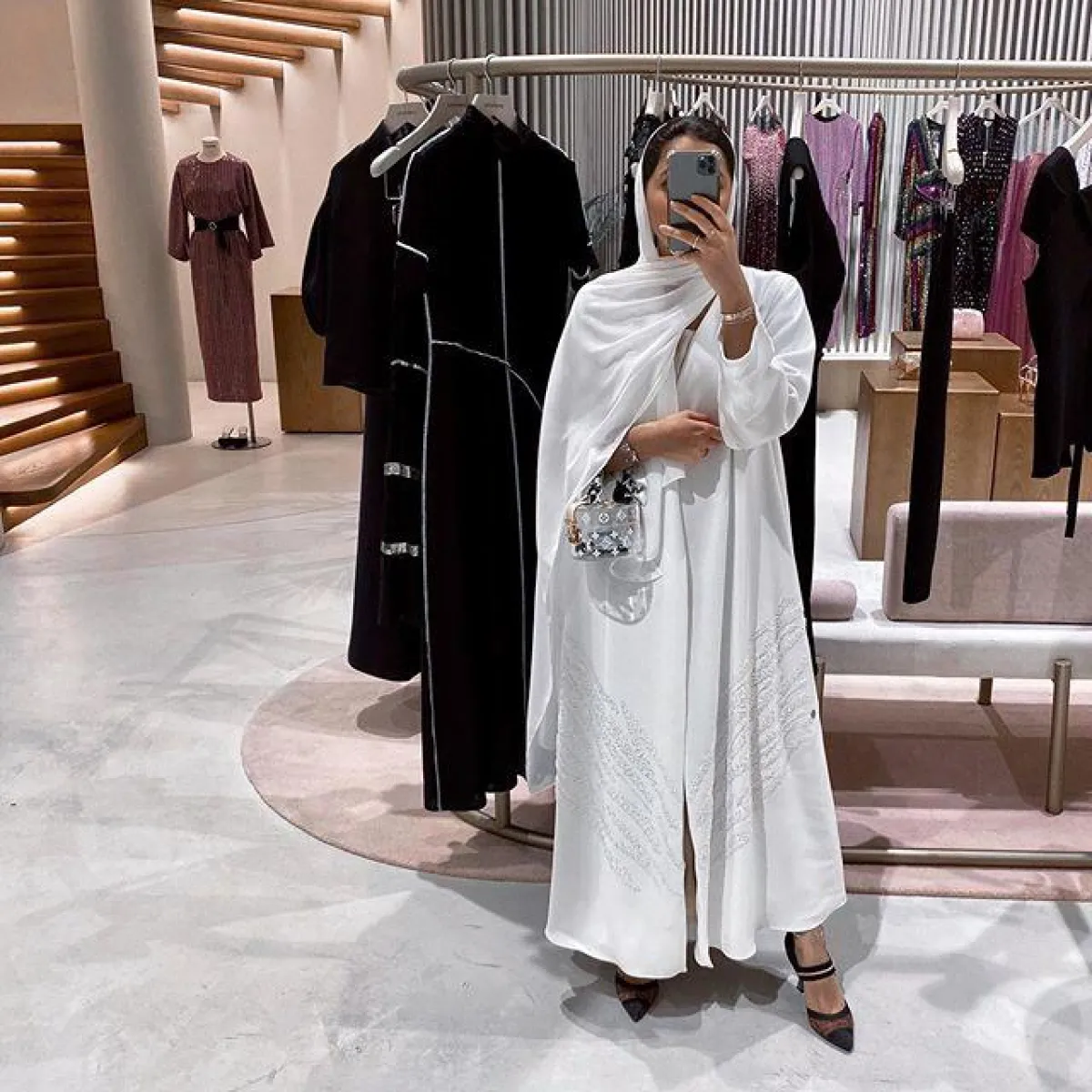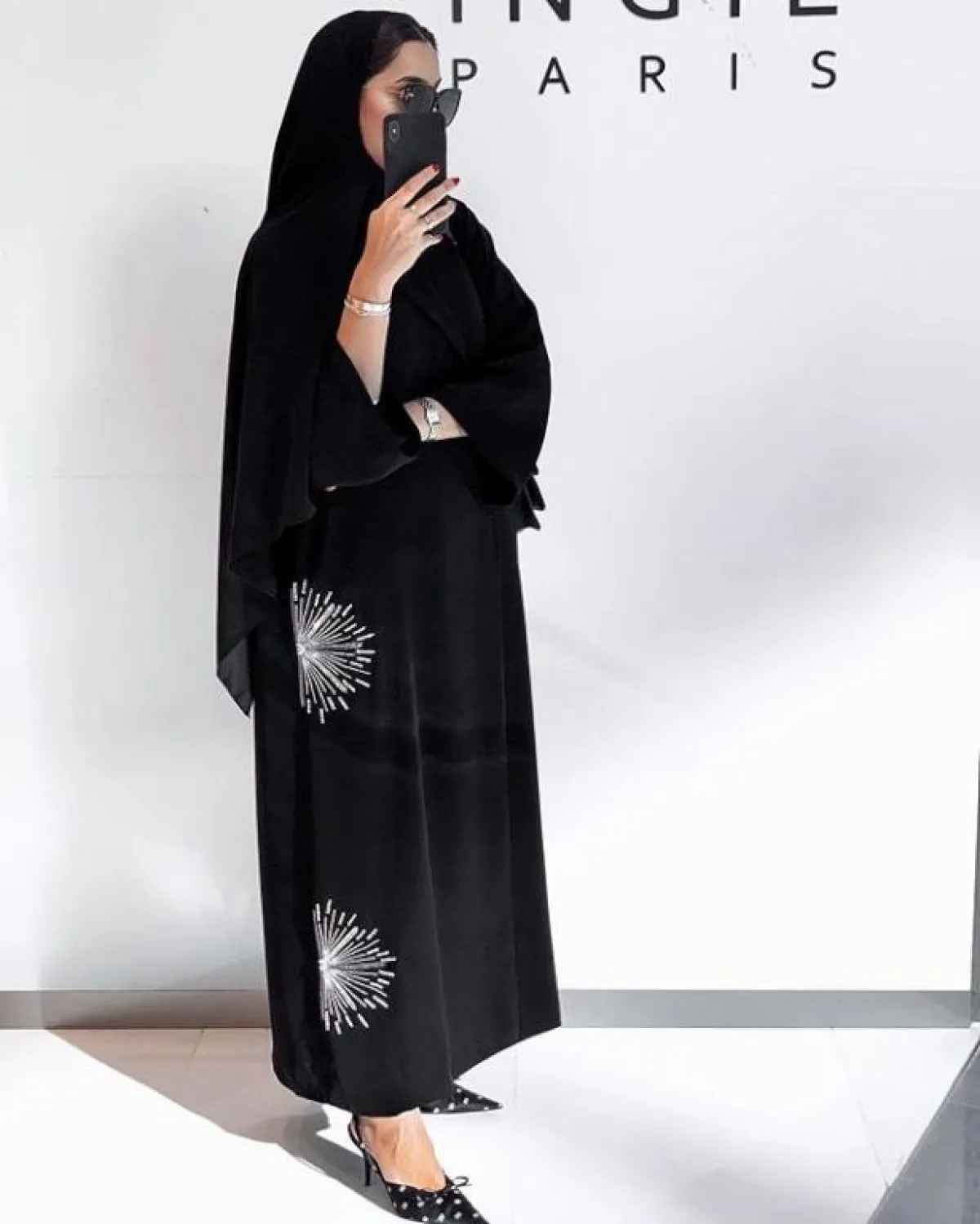 ليس هناك أفضل من عبايه تعكس الكثير عن شخصيتكِ، حتى وإن كانت بسيطة، كالعبايه السوداء المطرزة من نوف التميمي، تصميم بسيط مع لمسة من تطريزات الورود اللامعة الفضية على جانب العبايه.