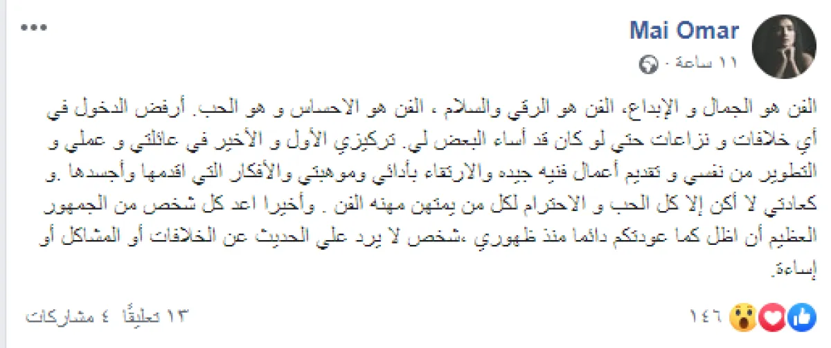 مي عمر وجهت رسالة مفتوحة إلى الجميع عبر حسابها بموقع الفيس بوك أكدت فيها رفضها الدخول في أية صراعات وقالت: الفن هو الجمال والإبداع، الفن هو الرقي والسلام، الفن هو الإحساس وهو الحب.