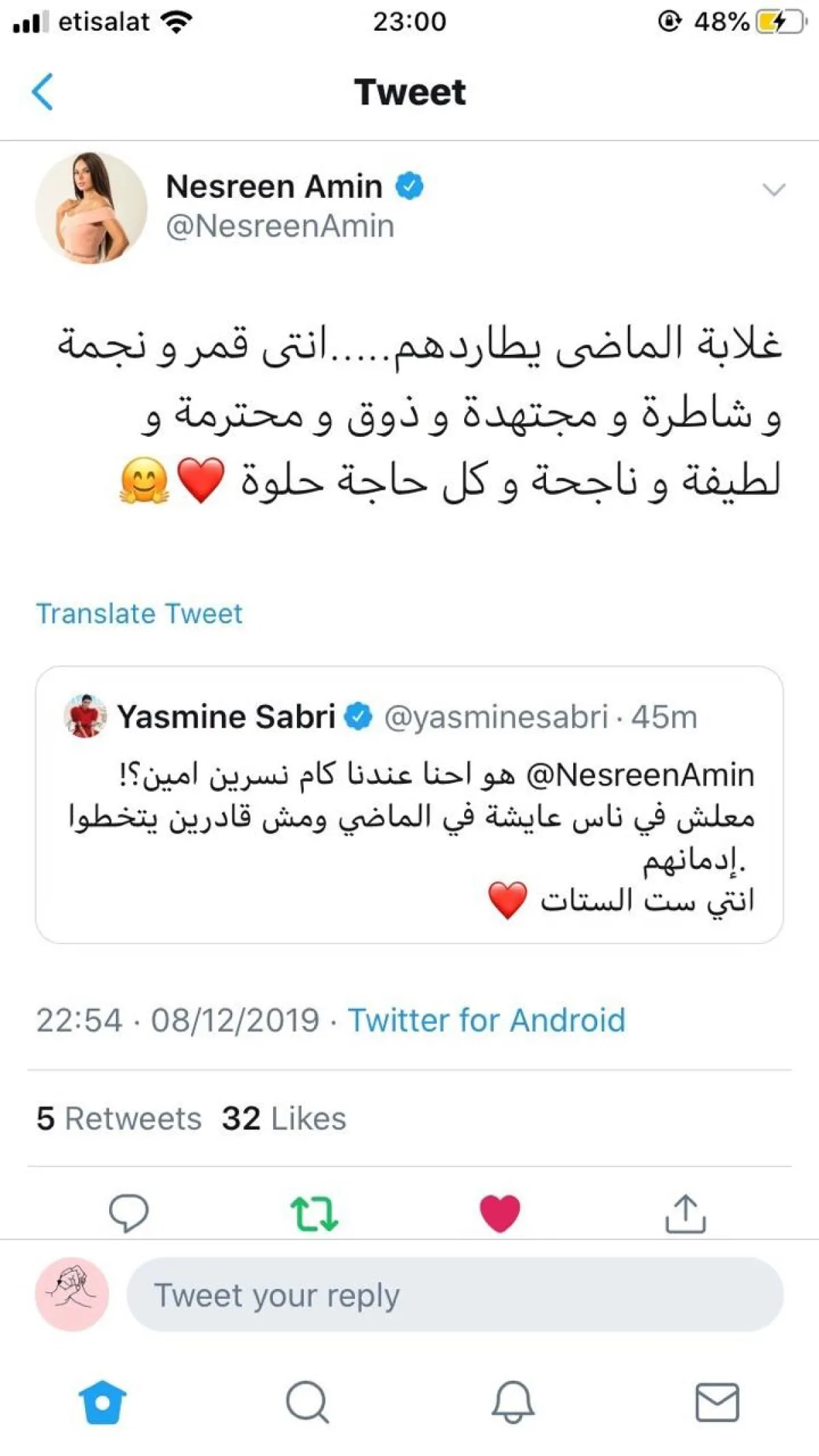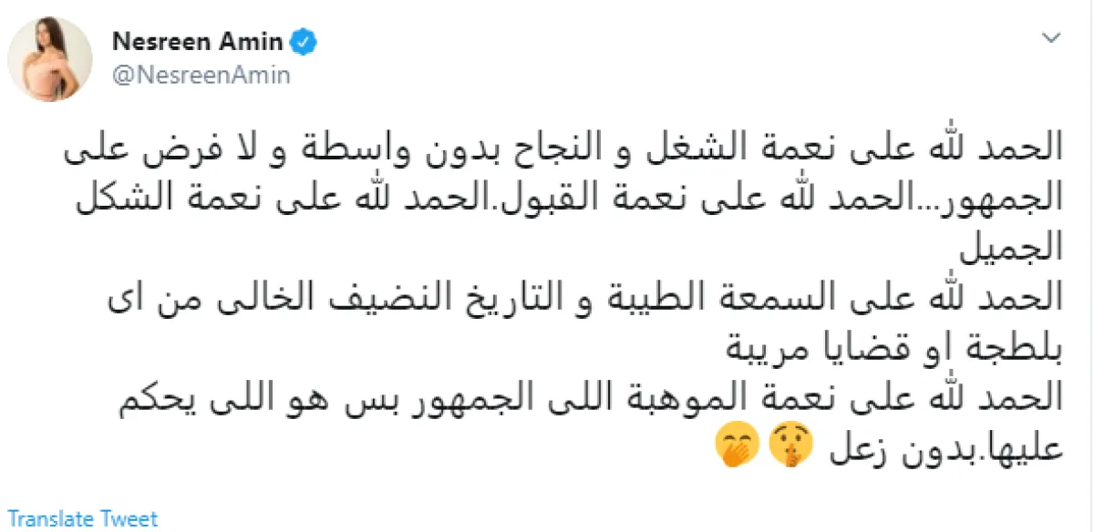 وغردت نسرين للدفاع عن زميلتها ياسمين صبري قائلة: غلابة الماضى يطاردهم.. إنتى قمر ونجمة وشاطرة ومجتهدة وذوق ومحترمة ولطيفة وناجحة وكل حاجة حلوة.