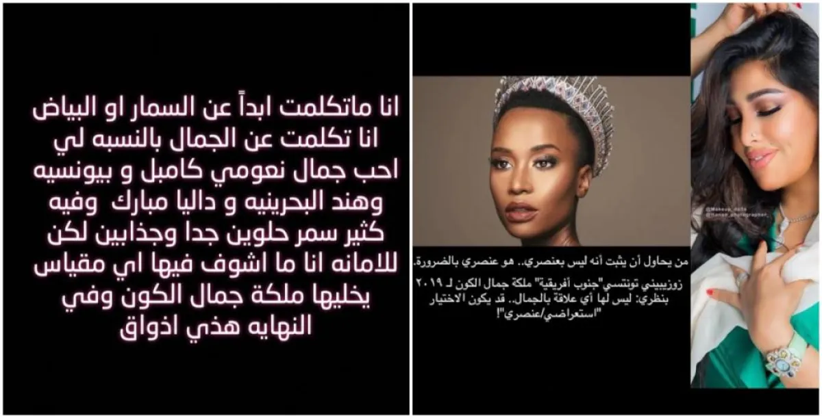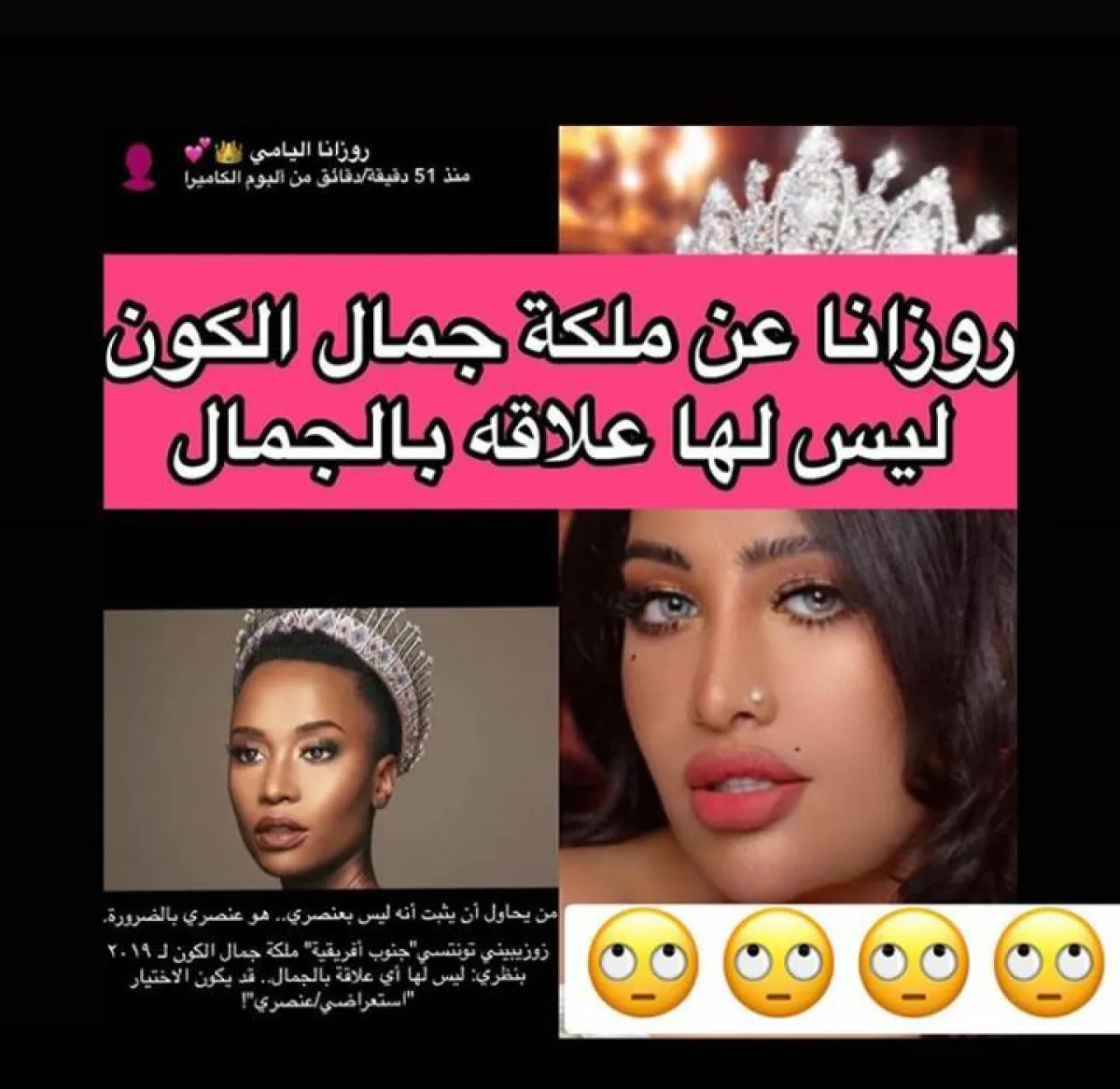 ونشرت روزانا اليامي على "سناب شات" :"من يحاول أن يثبت أنه ليس بعنصري. هو عنصري بالضرورة. زوزيبيني تونتسي "جنوب أفريقية" ملكة جمال الكون لـ2019. بنظري ليس لها علاقة بالجمال. قد يكون الاختيار "استعراضي\عنصري".