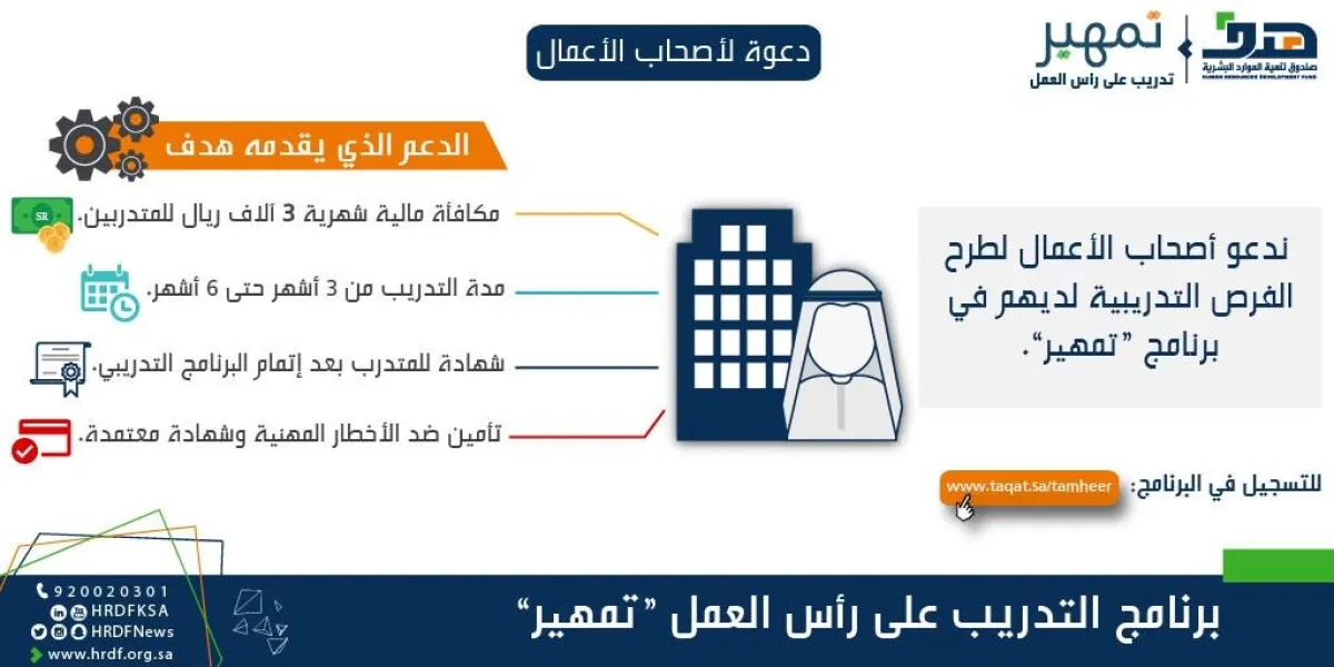 ودعا صندوق تنمية الموارد البشرية (هدف) الخريجين والخريجات إلى الاستفادة من الفرص التدريبية لبرنامج "تمهير"، واكتساب الخبرات والمهارات اللازمة المطلوبة لسوق العمل من خلال التدريب العملي في مواقع العمل الفعلية وفقًا لتخصصاتهم.