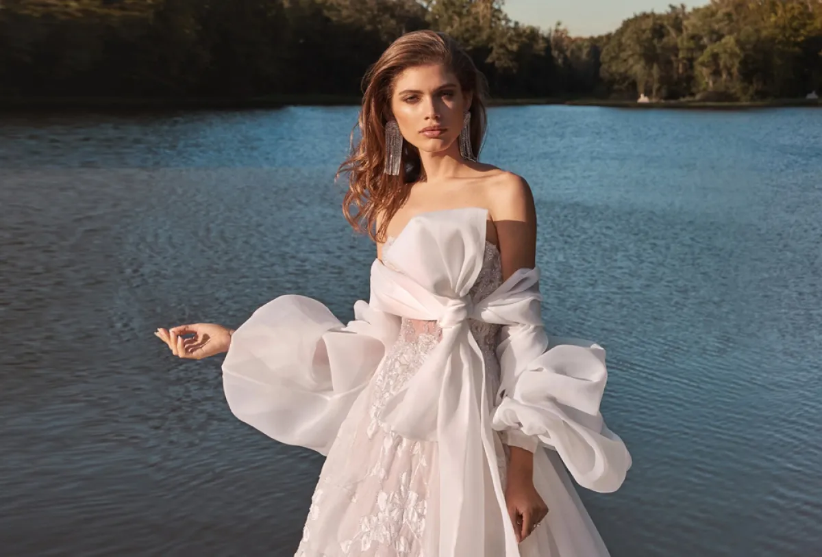يمكن أن تختار العروس فستان زفاف مزين بفيونكة على الصدر لتزيد من حجمه، مثل فستان زفاف Galia Lahav، وفستان زفاف Phuong My.