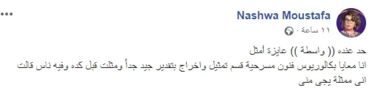 نشوى مصطفى، كتبت عبر حسابها الشخصي بموقع الفيس بوك: حد عنده (واسطة) عايزة أمثل، أنا معايا بكالوريوس فنون مسرحية قسم تمثيل وإخراج بتقدير جيد جدًا ومثلت قبل كده وفيه ناس قالت إني ممثلة يجي مني.