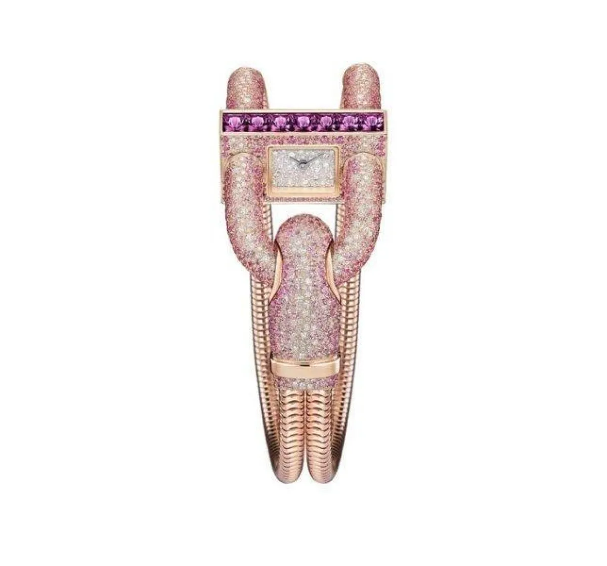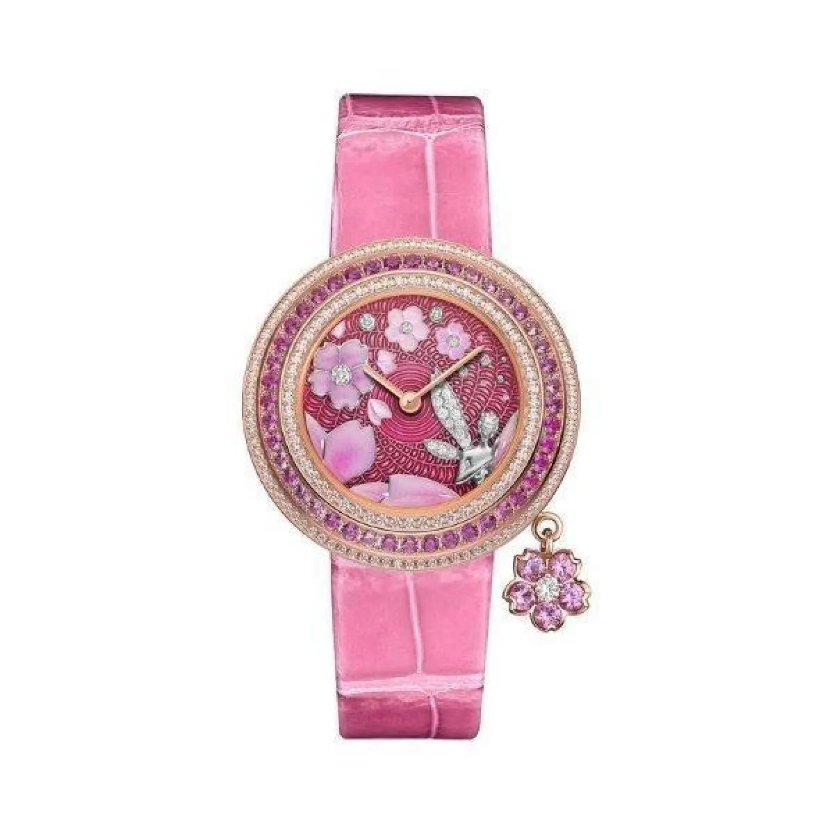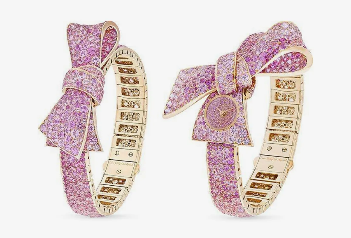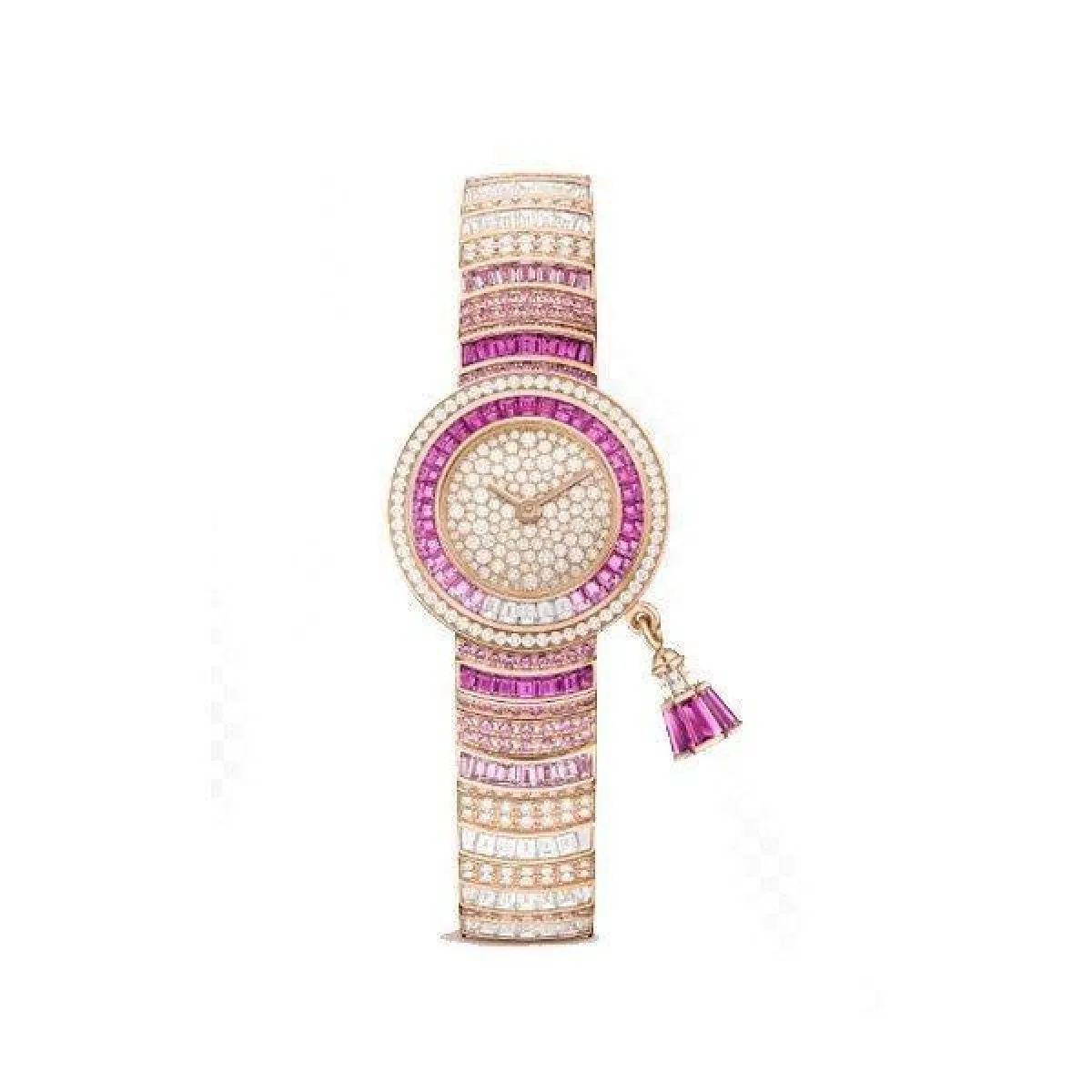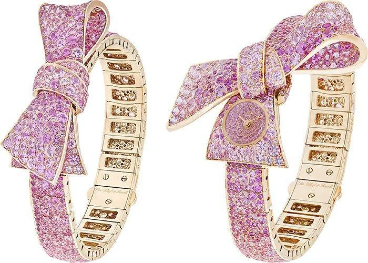 كما برزت الساعات المصنوعة من الذهب الوردي مع فصوص الألماس الوردية لمزيد من السحر والرومانسية، مثل ساعات فان كليف آند آربلز Van Cleef and Arpels.