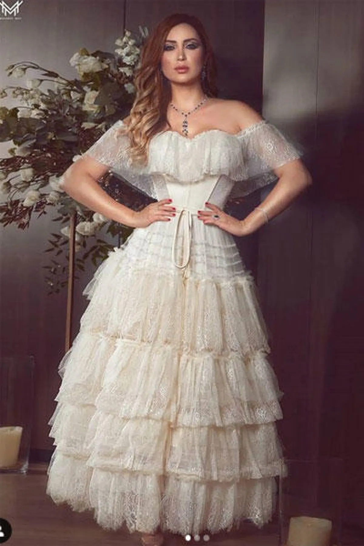 لفتت مايا دياب الأنظار مؤخراً بإطلالتها التي تحاكي العروس، وفستان أبيض مستوحى من الفراشة مع كشاكش الصدر، وتنورة ضيقة بقصّة حورية البحر ومكونة من طبقات من التول الأبيض، وهو من توقيع مصممها المفضل نيكولا جبران.