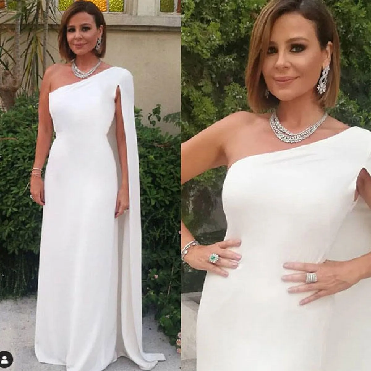 ولإطلالة عصرية، يمكن أن تختاري فستان أبيض ناعم بكم واحد مع كاب طويل ينسدل من الخلف مثل فستان كارول سماحة الذي يتناسب مع حفلات الزفاف النهارية.
