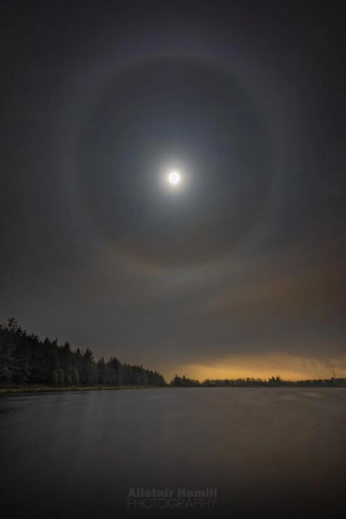 شارك المصور الفلكي «أليستير هاميل» صورة مذهلة، كتب فيها: «إنه لأمر لا يُصدق، هالة تبلغ 22 درجة حول القمر الليلة وهي تتلألأ عبر حجاب رفيع من سحابة سيروس - أتنبأ أن نظام الضغط المنخفض قد يتجه في طريقنا غداً لنشاهد هذه الظاهرة مرة أخرى!