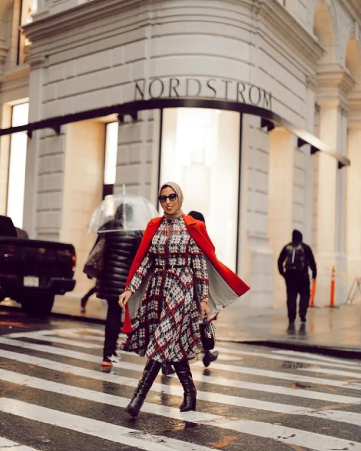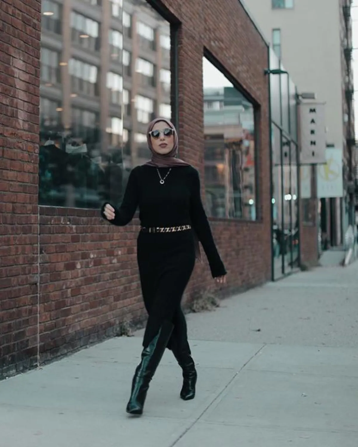 أو إن كان لديكِ فستان بسيط بلون مميز، من دون قصات لافتة، من الممكن أن تعتمديه مع هذا البوت، وحجاب بألوان النود، أو الأبيض، بحسب لون فستانكِ.
