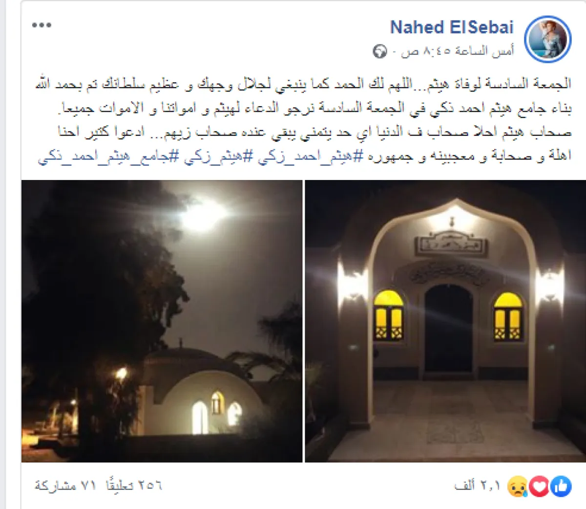 أضافت: تم بحمد الله بناء جامع هيثم أحمد زكي في الجمعة السادسة نرجو الدعاء لهيثم وأمواتنا والأموات جميعًا”.