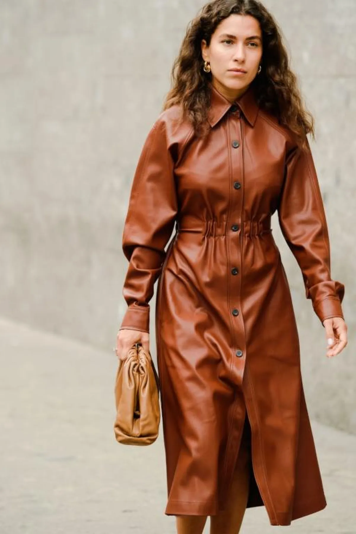 تبقى موضة الأزياء الجلد متربعة على عرش الموضة، حيث هيمنت على منصات عروض شتاء 2020 وانعكست على ستايلات الفاشينيستات في الشارع، اختاري فستانًا بموديل المعطف بهذه الخامة العصرية لإطلالة مميزة، يمكنكِ أيضًا اعتماد البنطال الجلد الواسع مع كنزة صوف خفيفة برقبة عالية، ومعطف طويل من لونها نفسه.