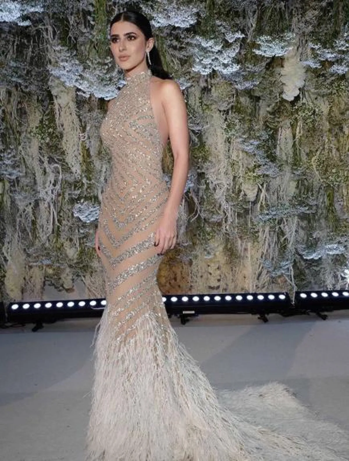 اختارت الفاشينيستا ديما شيخلي إطلالة براقة حملت توقيع رامي قاضي Rami Kadi وكانت عبارة عن فستان من قماش التول البيج المشكوك بشكل كامل بحبات الكريستال البراقة من سفاروفسكي Swarovski بقصة ذيل السمكة ومزين من الأسفل بالريش الناعم. وقد اختارت معه أقراطا ماسية.