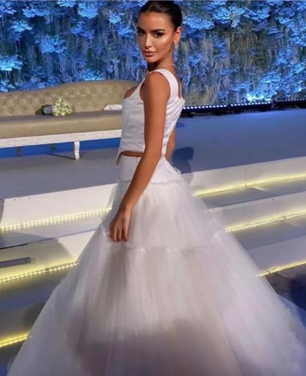أما التصميم الثاني، فقد كان أكثر عصرية عبارة عن كورسيه باللون الأبيض مع تنورة كلوش طويلة من التول الأبيض، وقد اختارت مع اللوك مجوهرات ماسية ناعمة.