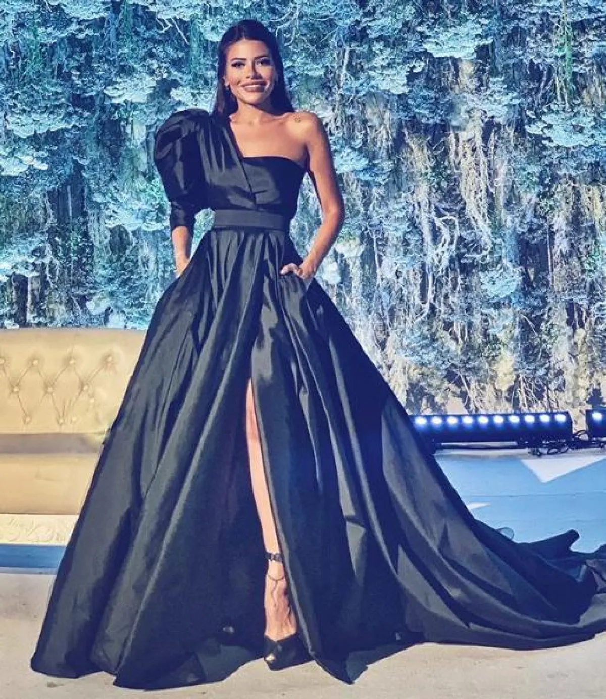العنود بدر المعروفة بفوزازا ، اختارت اللون الأسود الفاخر على فستان سهرة من تصميم مرمر حليم Marmar Halim كنا قد شاهدنا نسرين طافش فيه منذ فترة، بقصة الكتف الواحد ومحدد الخصر مع تنورة منفوشة ولها فتحة طويلة على الساق، وقد نسقت معه صندل كعب عالٍ أسود.