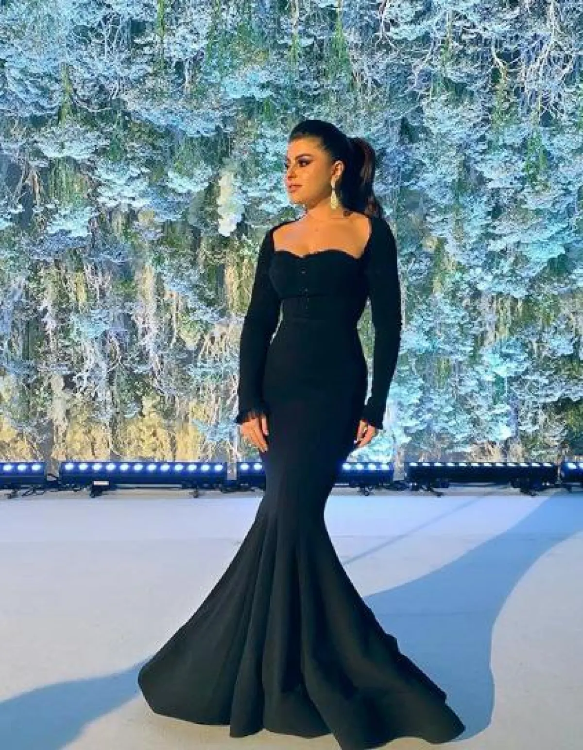 علا فرحات اعتمدت إطلالة ذات طابع كلاسيكي في فستان من المخمل باللون الأسود من أيدن فاشن Aden Fashion متفاوت الأطوال ومبطن بقماش الساتان الأبيض، وقد اعتمدت معه قفازات عالية، وصندل كعب عال أسود وأقراطا بارزة.