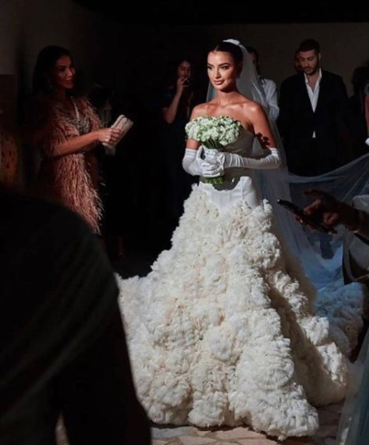 لنتكلم بداية عن العروس رانيا فواز التي تألقت في فستاني زفاف حملا توقيع مواطنتها العراقية مصممة الأزياء زينة زكي. الأول كان فستاناً بتصميم فاخر بقصة الكورسيه من الأعلى، ومزين بطبقات كثيفة من الكشكش، وقد نسقت معه قفازات طويلة بيضاء، وبذلك أضافت عليه لمسات مستوحاة من الثمانينات. واختارت أيضاً طرحة طويلة من التول.
