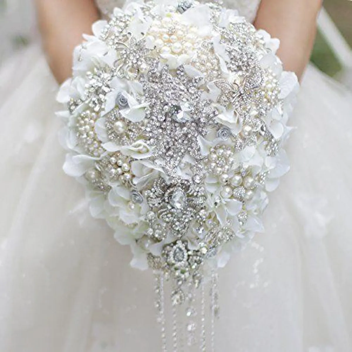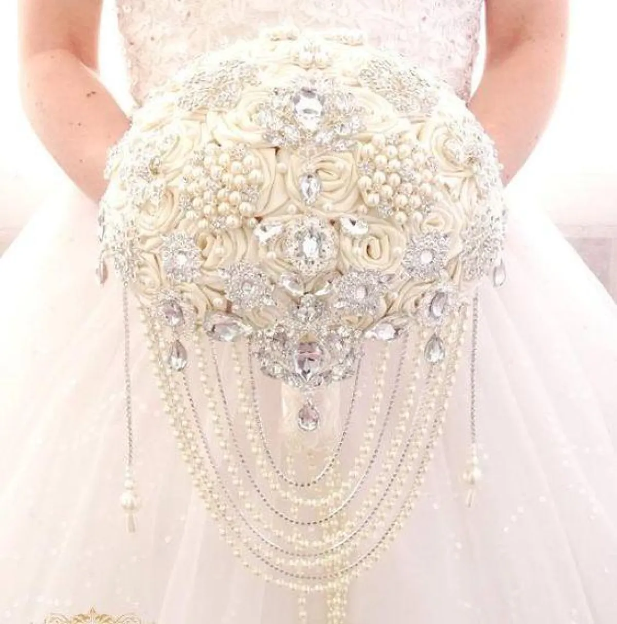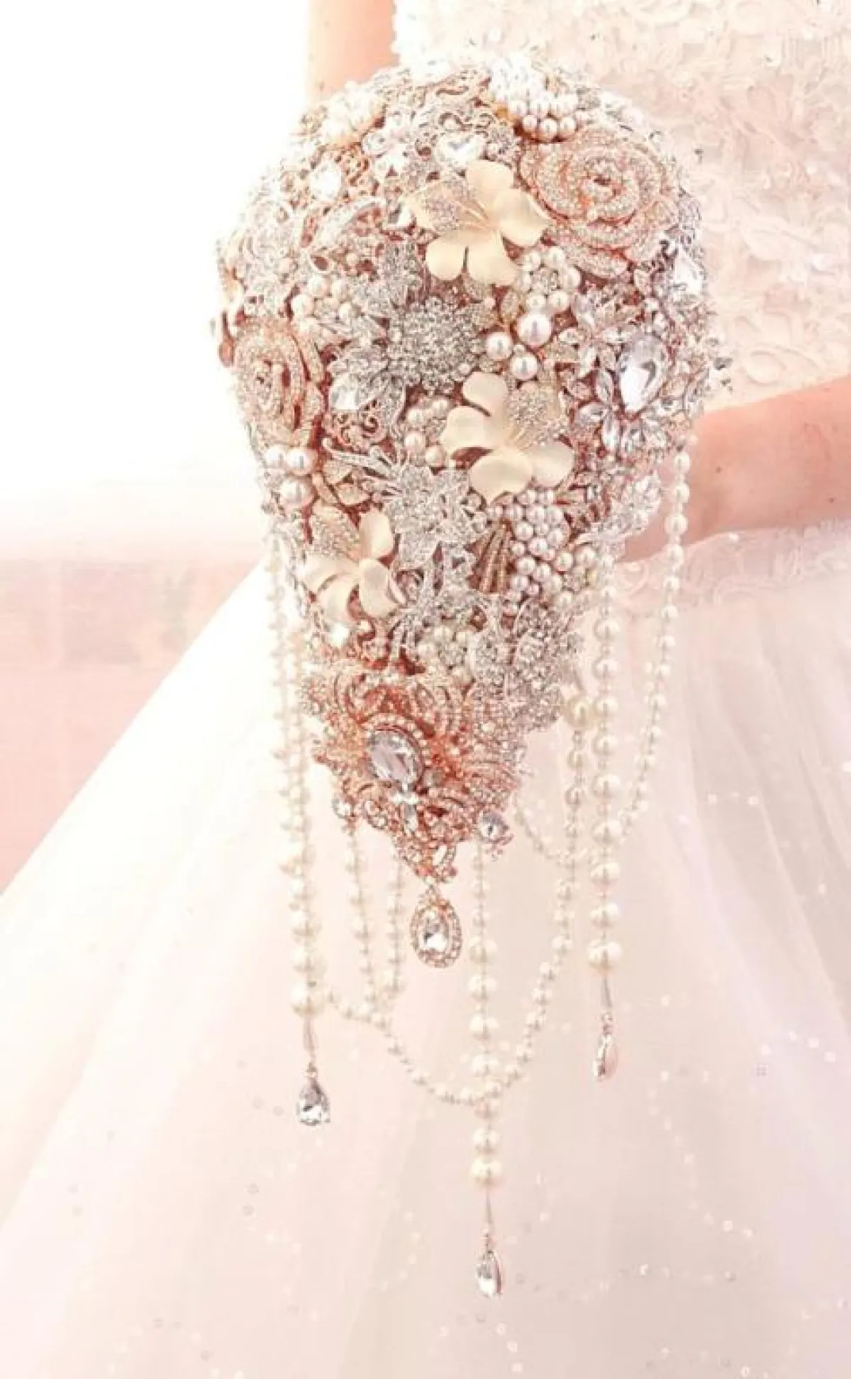 باقة الورود المرصعة بأحجار الكريستال مع اللؤلؤ هو خيار غني ومُترف بشكل واضح، ولكنه يحتاج إلى تنسيق بين اللؤلؤ والكريستال، حتى لا تبدين مبهرجة، ويمكنك أيضًا اعتماد فكرة السلاسل المتدلية من الباقة.