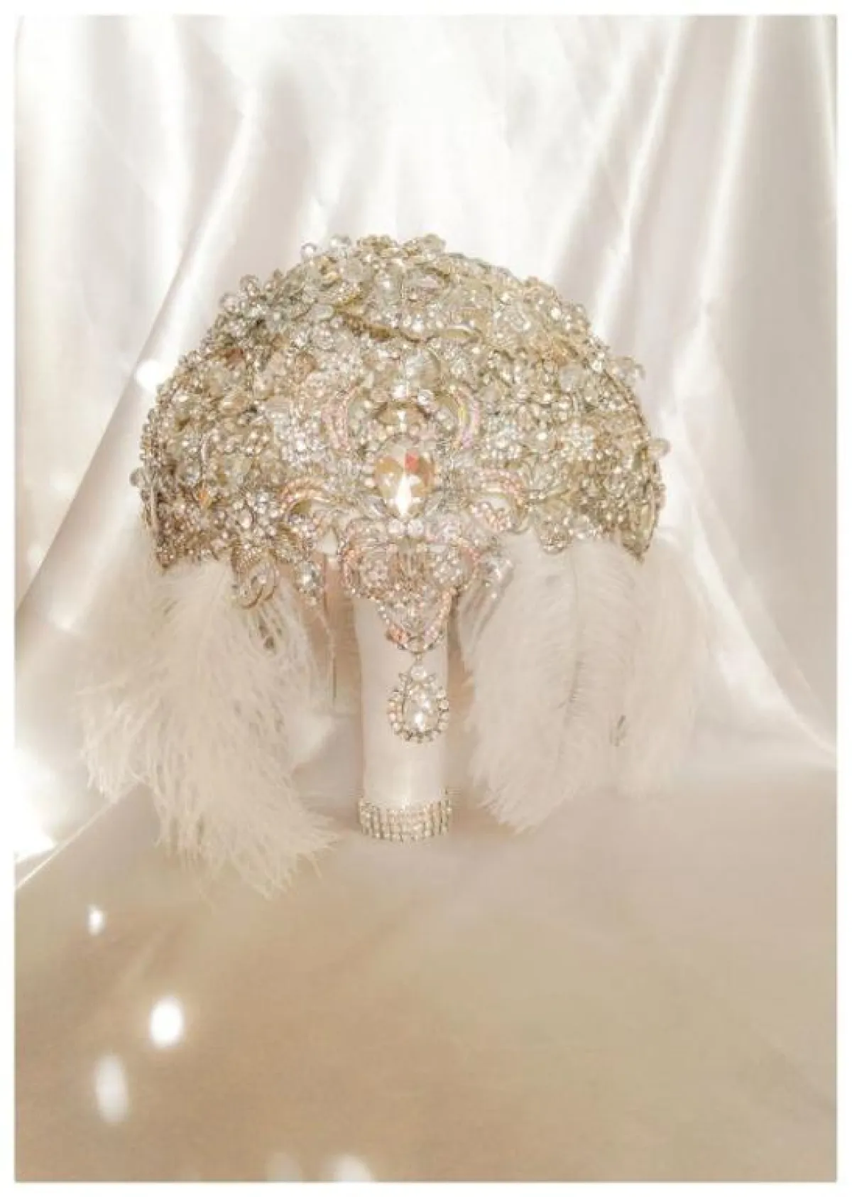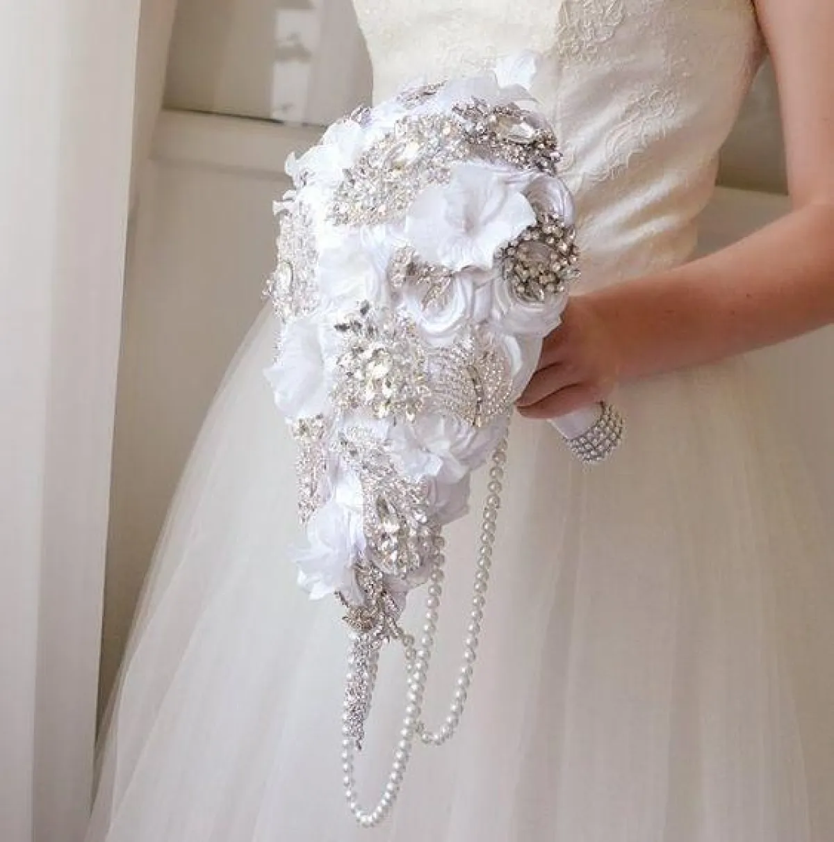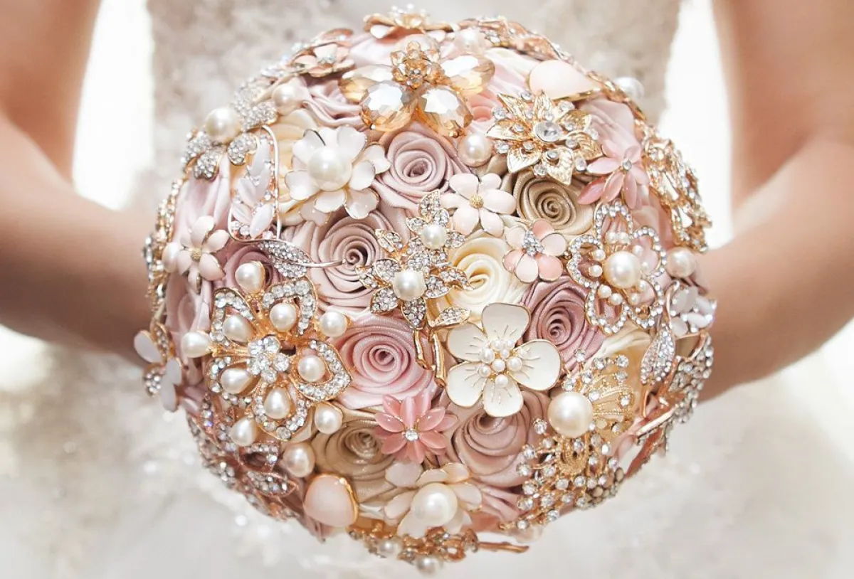 باقة الورود المرصعة بأحجار الكريستال مع اللؤلؤ هو خيار غني ومُترف بشكل واضح، ولكنه يحتاج إلى تنسيق بين اللؤلؤ والكريستال، حتى لا تبدين مبهرجة، ويمكنك أيضًا اعتماد فكرة السلاسل المتدلية من الباقة.