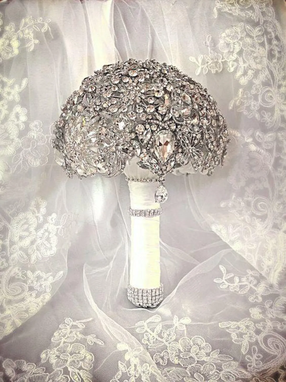 لفتنا تلك الباقة، والتي لا تحتوي على زهور أيضًا، لكن تصميم أحجار الكريستال مستوحى من أشكال الأحجار الثلج، لهذا فهي مناسبة أكثر لحفل زفافكِ في الشتاء، مع اليد الملفوفة بقماش الساتان الناعم.