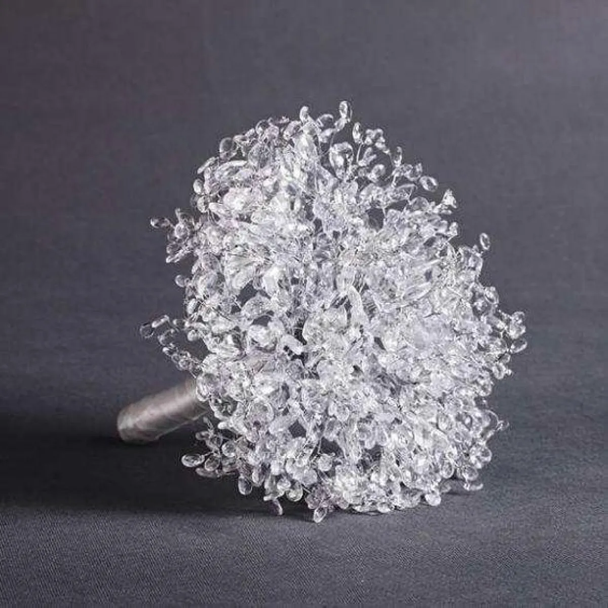 إن كنت ترغبين في حمل مسكة عروس على الموضة، وتفكرين بأحجار الكريستال، فإليكِ الباقة صغيرة الحجم، باللون الأبيض، مع أحجار كريستالية شفافة تحل محل الورود، للمسة غاية في الترف، تناسب العروس التي تبحث عن الإطلالة الأسطورية.