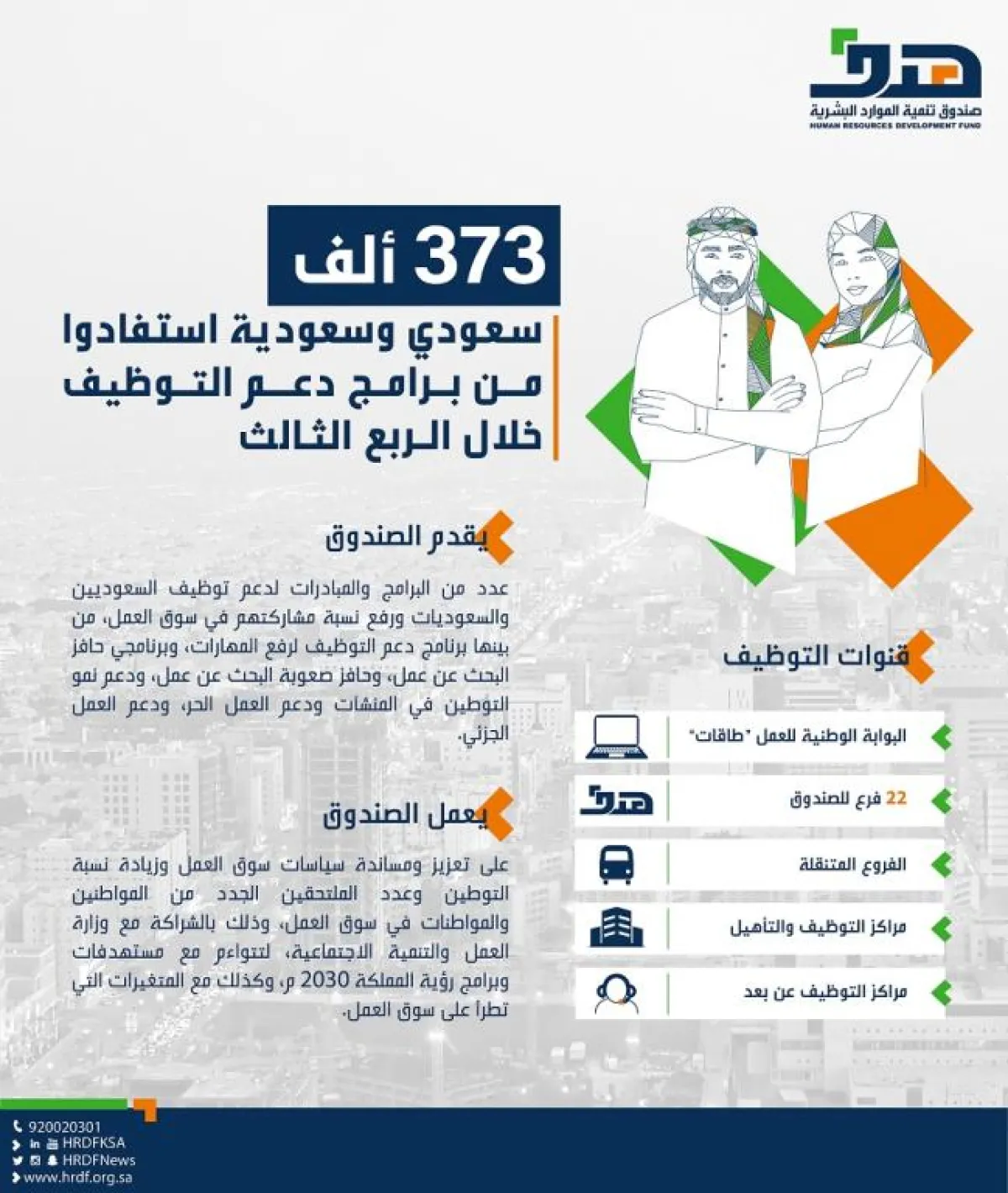 وجدد الصندوق دعوته، لأبناء وبنات الوطن، للاستفادة والتعرف على برامجه وخدماته عبر زيارة أحد فروعه المنتشرة في مدن ومحافظات المملكة، أو زيارة موقع الصندوق الالكتروني Www.hrdf.org.sa أو حساباته في منصات التواصل الاجتماعي، أو من خلال مركز الاتصال على الرقم 920020301 .