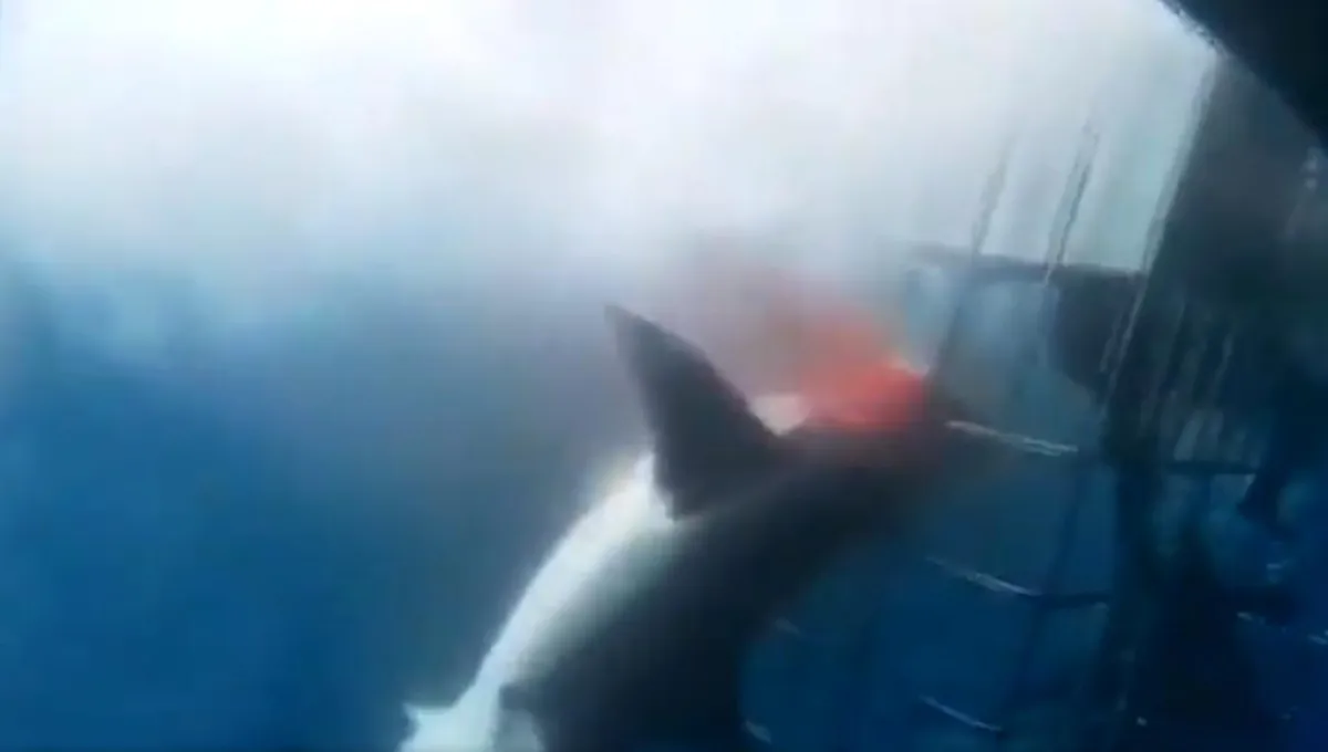 وبدا أن القرش قاب قوسين وأدنى من اقتحام القفص وتحطيمه ومهاجمة الغواصين، لكنه علق بين قضبانه، وسرعان ما انتشر دم الحيوان الضخم في المياه، فيما بدا عليه الاضطراب الشديد كأنه ينازع الموت.
