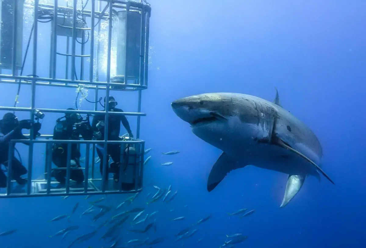 رصد مقطع فيديو لحظات مرعبة تعرض لها عدد من الغواصين كادوا يقعون فريسة لقرش أبيض مفترس قبالة سواحل المكسيك، حيث يظهر الفيديو، الذي تم تداوله على نطاق واسع، سمكة مفترسة من فصيلة القرش الأبيض الكبير، وهي تهاجم غواصين داخل قفص قرب جزيرة جوادلوبي في المحيط الهادئ.