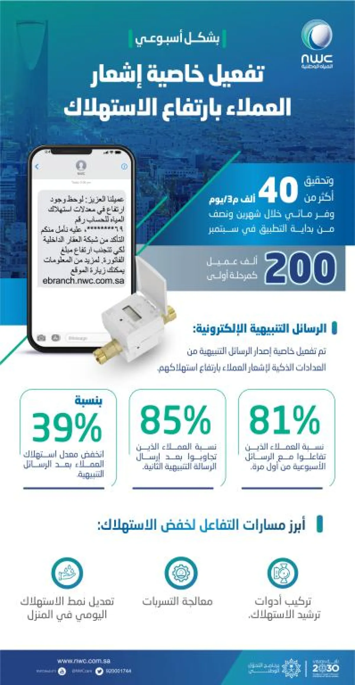 وبيّنت الشركة أن نسبة العملاء الذين تفاعلوا مع الرسائل الأسبوعية من أول مرة بلغت 81 %، فيما ارتفعت النسبة إلى 85% بعد إرسال الرسالة التنبيهية الثانية، موضحة أن هذه الاستجابة تضمنت معالجة العملاء للتسربات الظاهرة وغير الظاهرة، وتركيب الأدوات الصحية المرشّدة، إضافة إلى تغيير سلوكيات الاستخدام اليومي للمياه في المنزل.