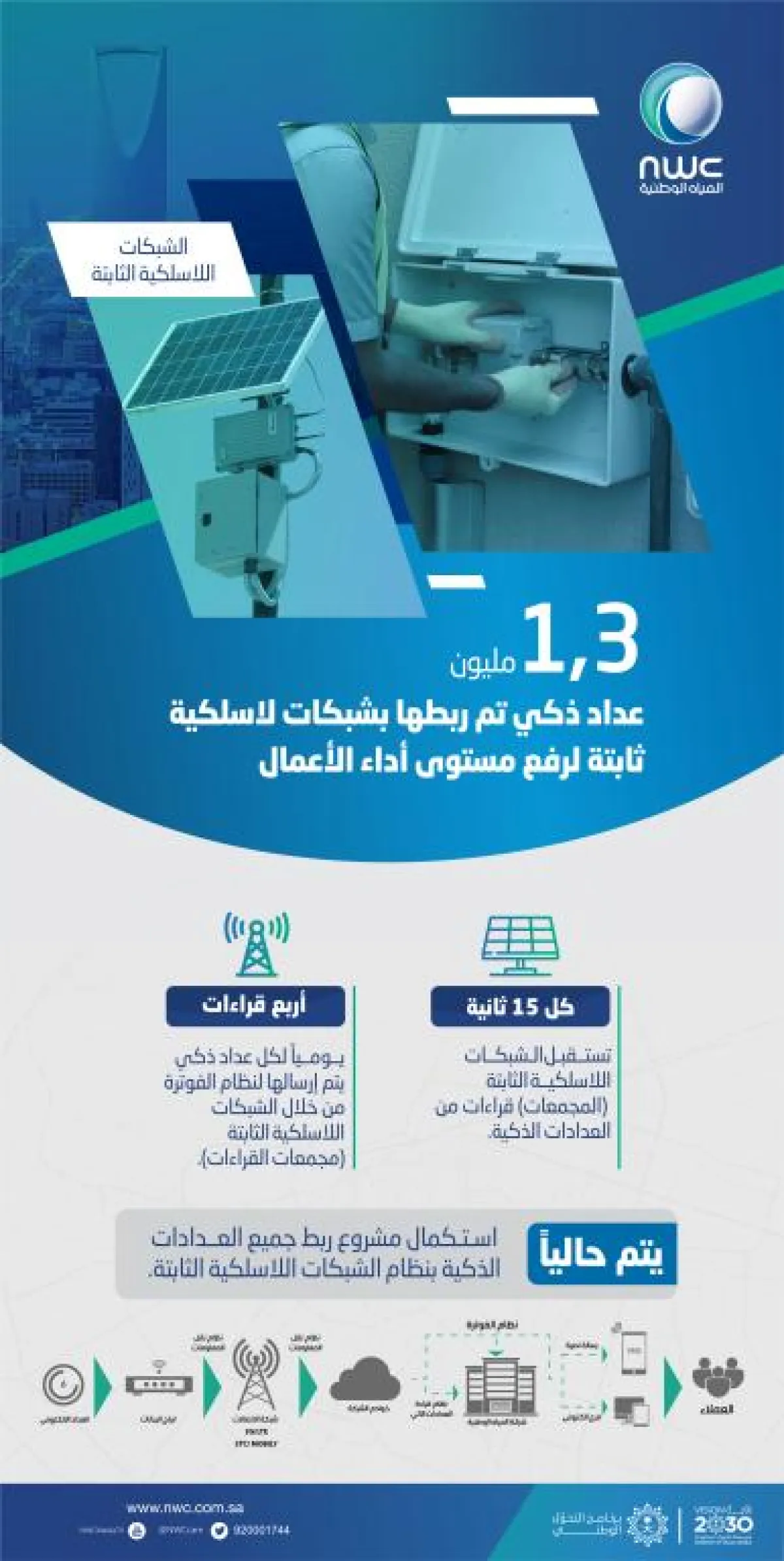 وأكدت الشركة أن تلك النتائج جاءت بعد تركيب أكثر من 1.8 مليون عداد ذكي في مناطق المملكة المختلفة، مشيرة إلى أنها تمثل نسبة 93% مِن مليوني عداد ذكي. كما نجحت الشركة في ربط 1,3 مليون عداد ذكي بشبكات لاسلكية ثابتة (مجمعات القراءات)، لوصول القراءات إلى أنظمة الشركة دون تدخل بشري حتى صدور فاتورة العميل، مؤكدة أن منظومة العدادات الذكية ستكتمل فيمنتصف عام 2020م.