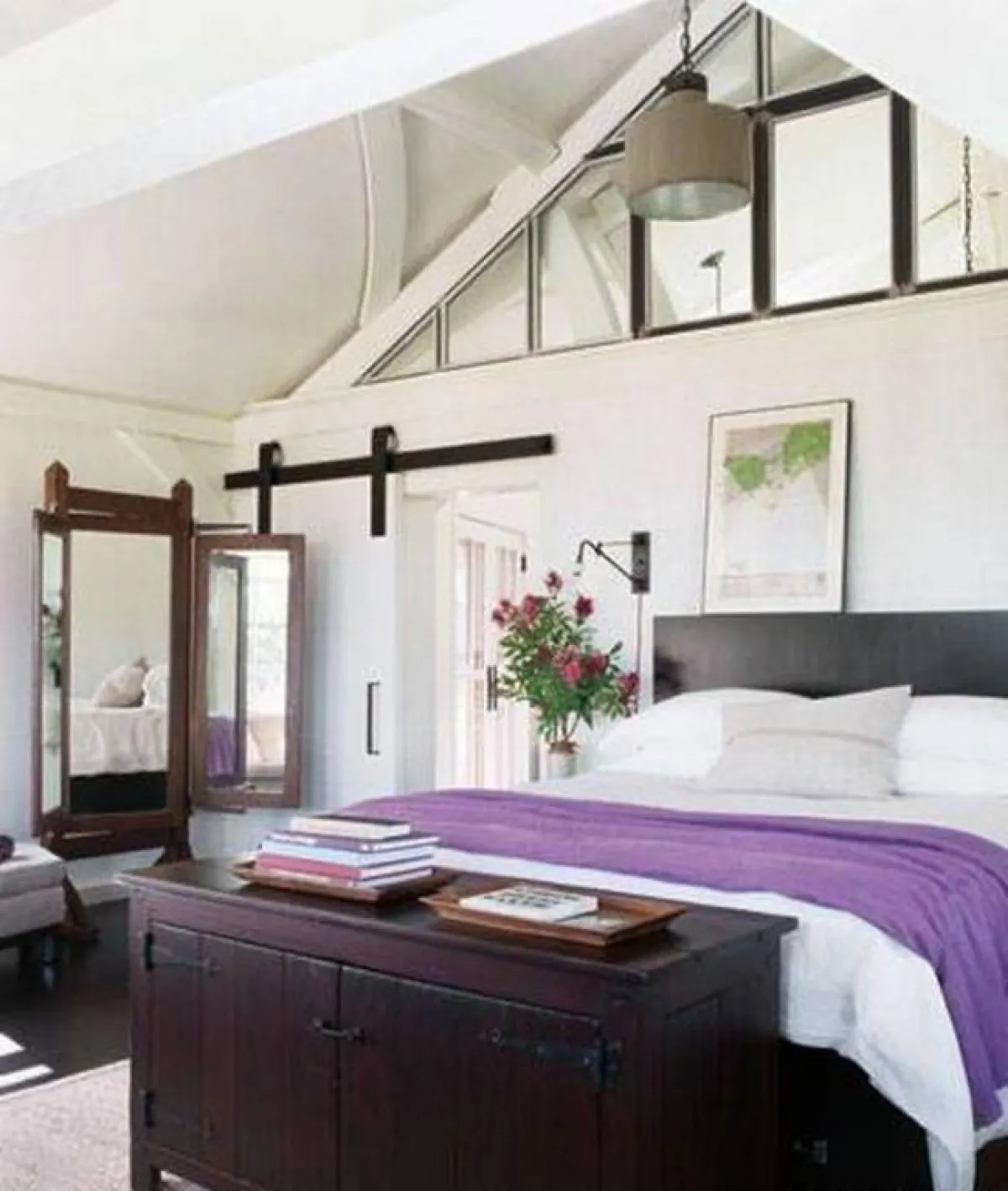 وتنبض غرفة النوم الرئيسيّة بالدفء، فتمنح المالكة شعوراً بالاسترخاء، عندما تستلقي على سريرها المزدوج، الذي يغطيه مفرش أبيض يعلوه شرشف بنفسجيّ، فيما تتمركز إلى كلّ جانب منه طاولة من الخشب، تحمل مزهرية، ولا تغيب الكتب عن طاولة خشب حمراء داكنة.
