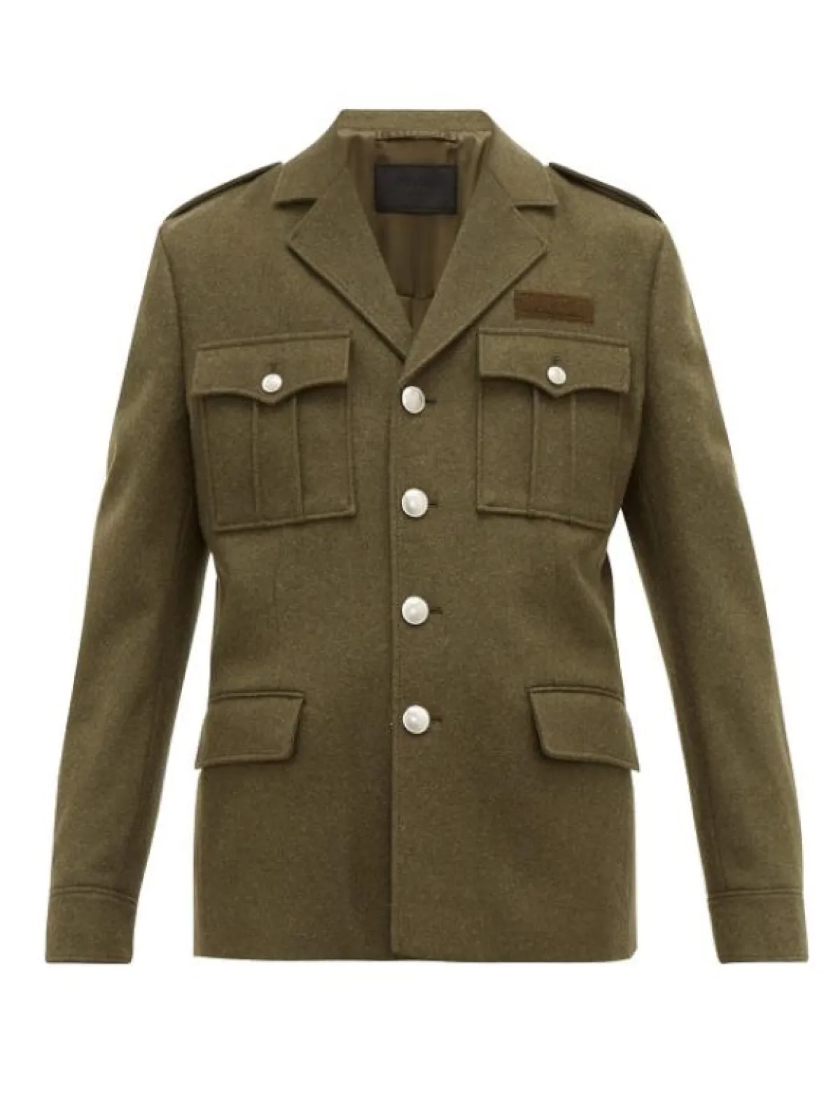 وقد قدمت دار Prada جاكيت باللون الأخضر الزيتي تميز بأزراره البيضاء التي كسرت قليلاً من الكلاسيكية.