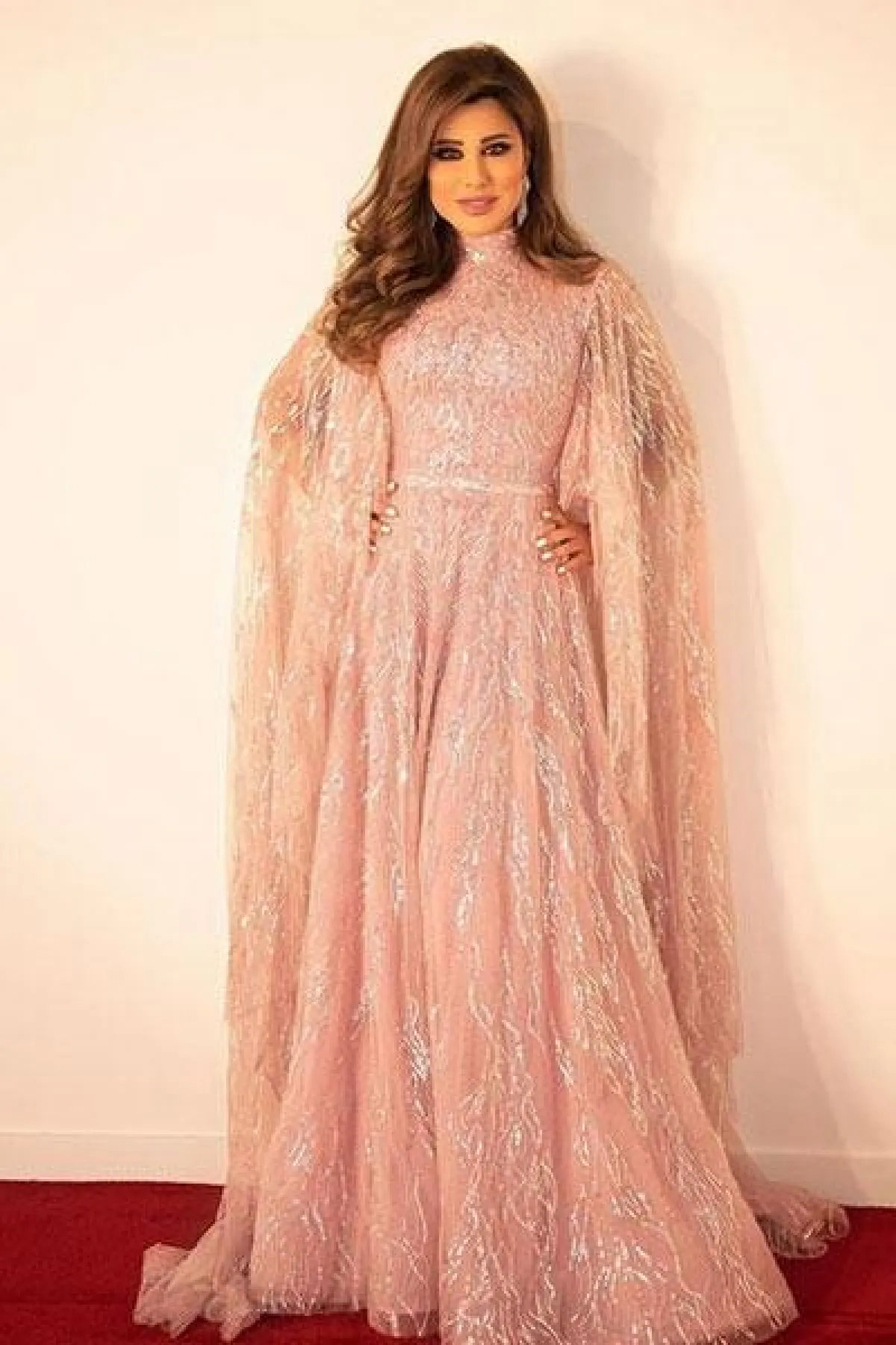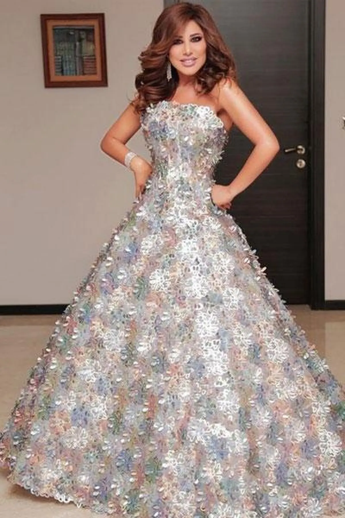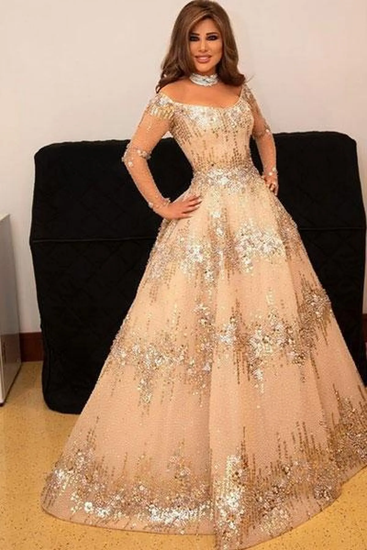 تتميز فساتين نجوى كرم بالفخامة والأنوثة في نفس الوقت، وقد ارتدت في أحدث إطلالاتها فستان منفوش بأكمام طويلة شفافة ومرصع بتطريزات برّاقة.