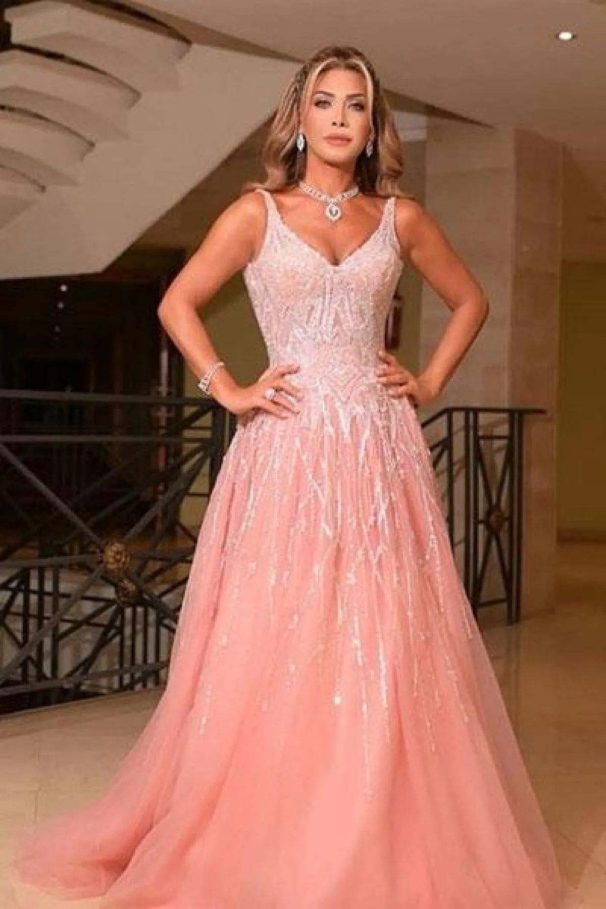 أعجبنا فستان نسرين طافش المنفوش بالقبّة الـV والحمّالات، وزاد سحره بالتطريزات البرّاقة على التنورة التول.