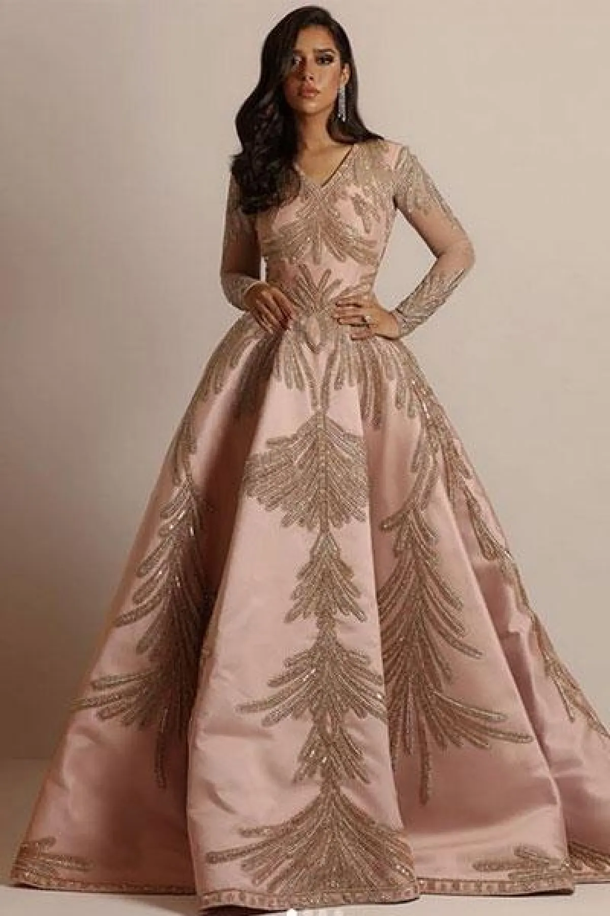الفستان باكمام طويلة شفافة ومطرزة، مع حزام حول الخصر ليبرز نحافته.