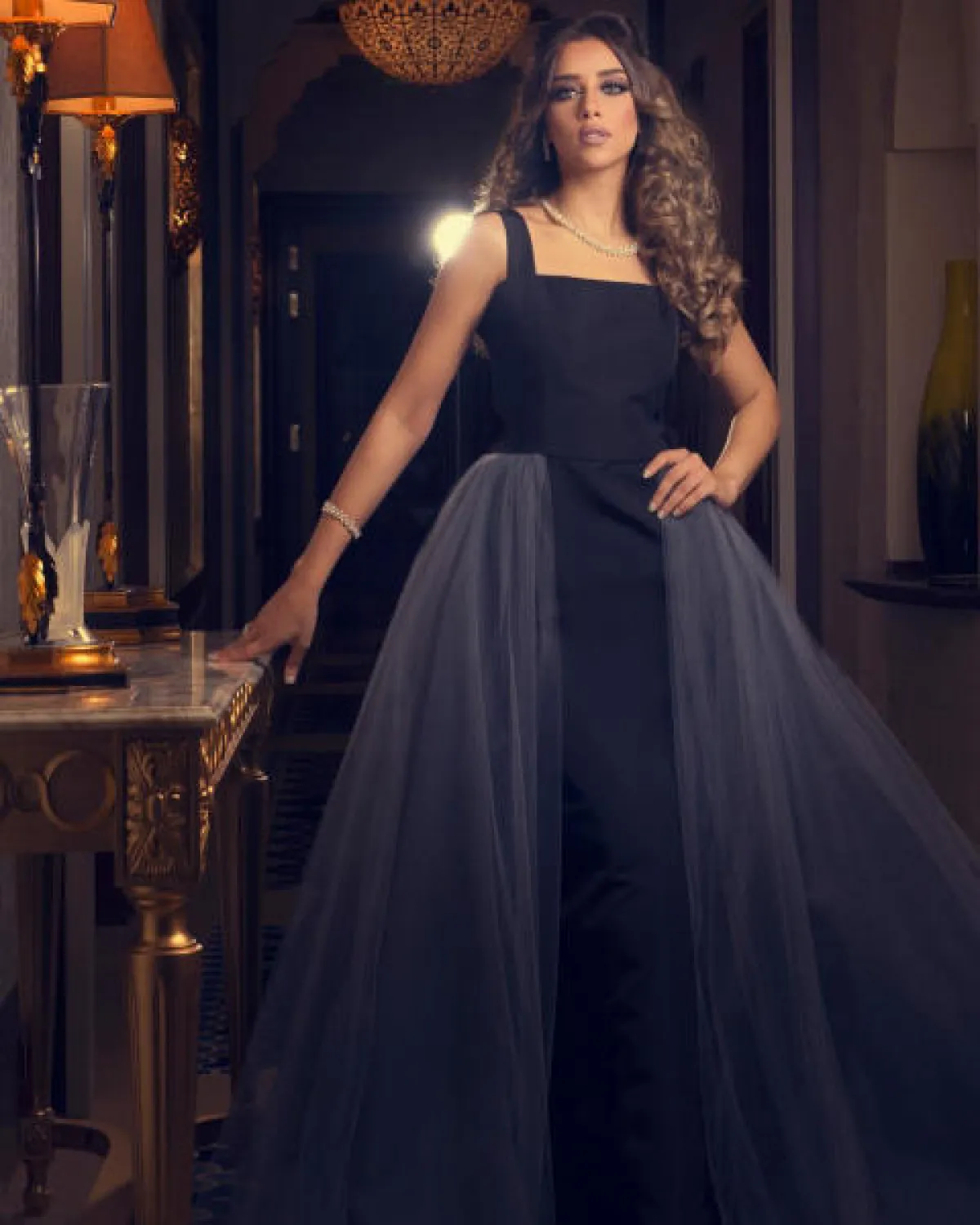 اطلالة مميزة في فستان سهرة باللون الأسود بتصميم فاخر تألقت بها بلقيس فتحي، القسم العلوي منه مصنوع من المخمل الناعم، وتنورته بقصة ذيل السمكة من القماش البراق، طرفها مزين بالريش بطريقة أنيقة، وقد اختارت معه عقدًا ماسيًّا بارزًا.