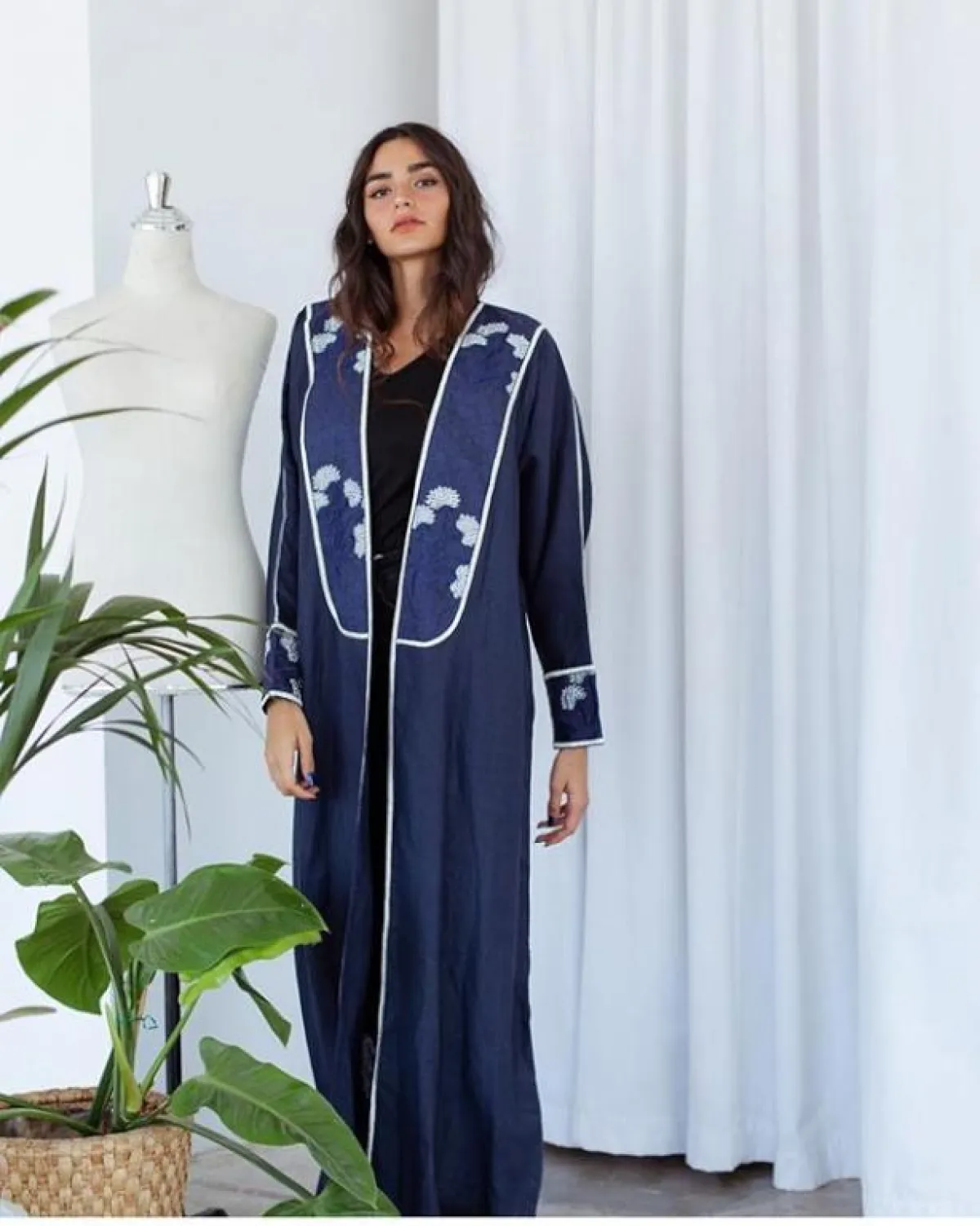 التفاصيل الصغيرة تُضيف لمسة خاصة لعبايتكِ كهذا التصميم من Nada Ghazal Abaya، مع الياقة العريضة المزينة بالورود، للعباية باللون الكحلي، مناسبة لهذا الشتاء، من الممكن أن تنسقي معها حجابكِ باللون الأبيض سيبدو مميزًا مع اللون الكحلي، وكذلك مع الورود البيضاء بالياقة.
