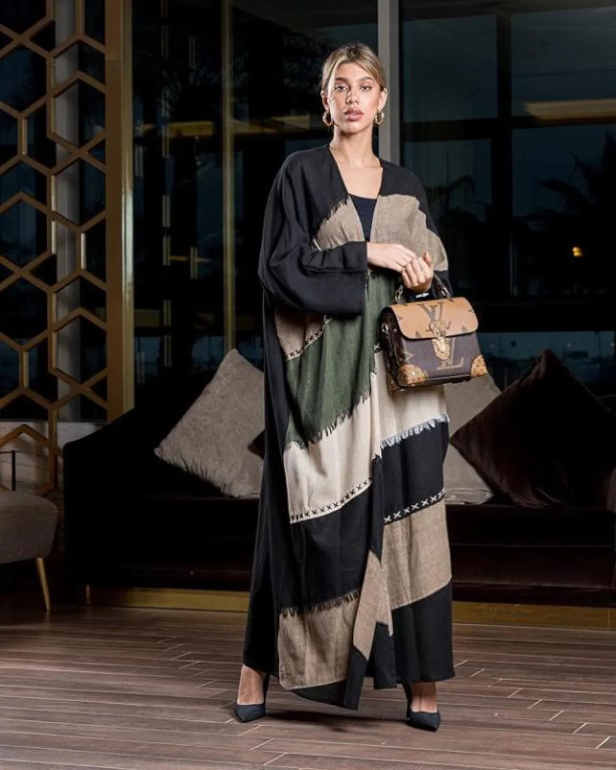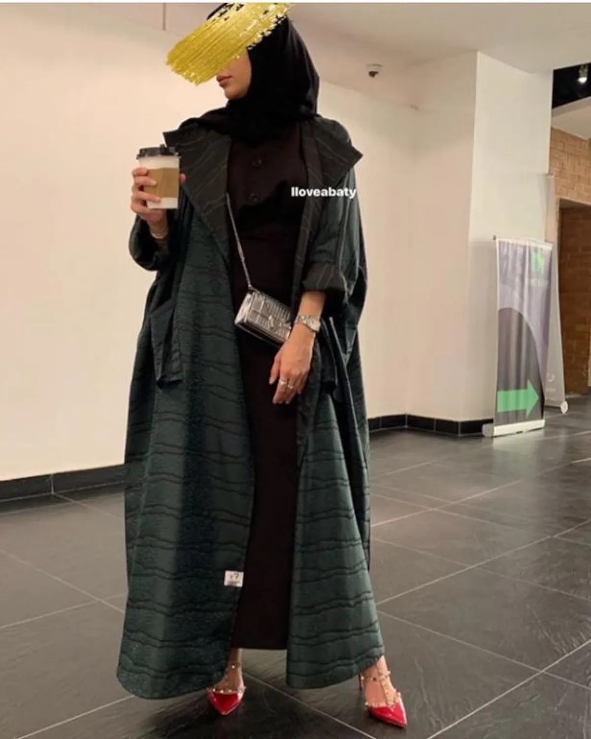 من الممكن أن تعتمدي الأسود الفخم كأساس لعبايتكِ مع ألوان أخرى كالموجودة بهذا التصميم من Dar Aldalal مثل الأخضر والبيج، وهي تناسب أيضًا أجواء الشتاء المختلفة، نسقيها مع الفساتين الشتوية الضيقة، أو البناطيل الجينز لاطلالة مودرن.