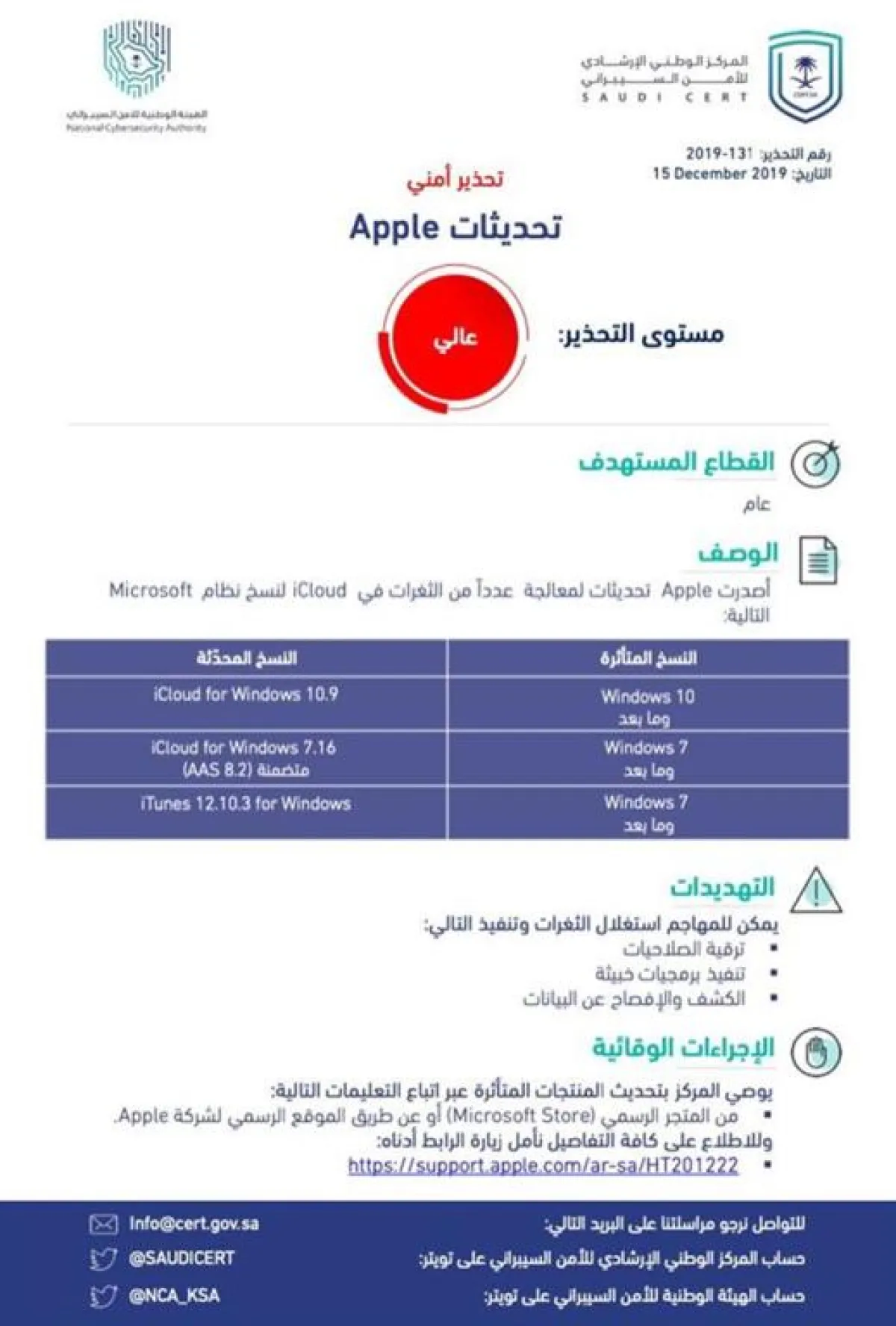 أصدر المركز الوطني الإرشادي للأمن السيبراني عبر حسابه الرسمي على موقع التواصل الاجتماعي "تويتر"، تحذيراً أمنياً عالي المستوى خاصاً بـ icloud "أبل" لنسخ نظام مايكروسوفت.